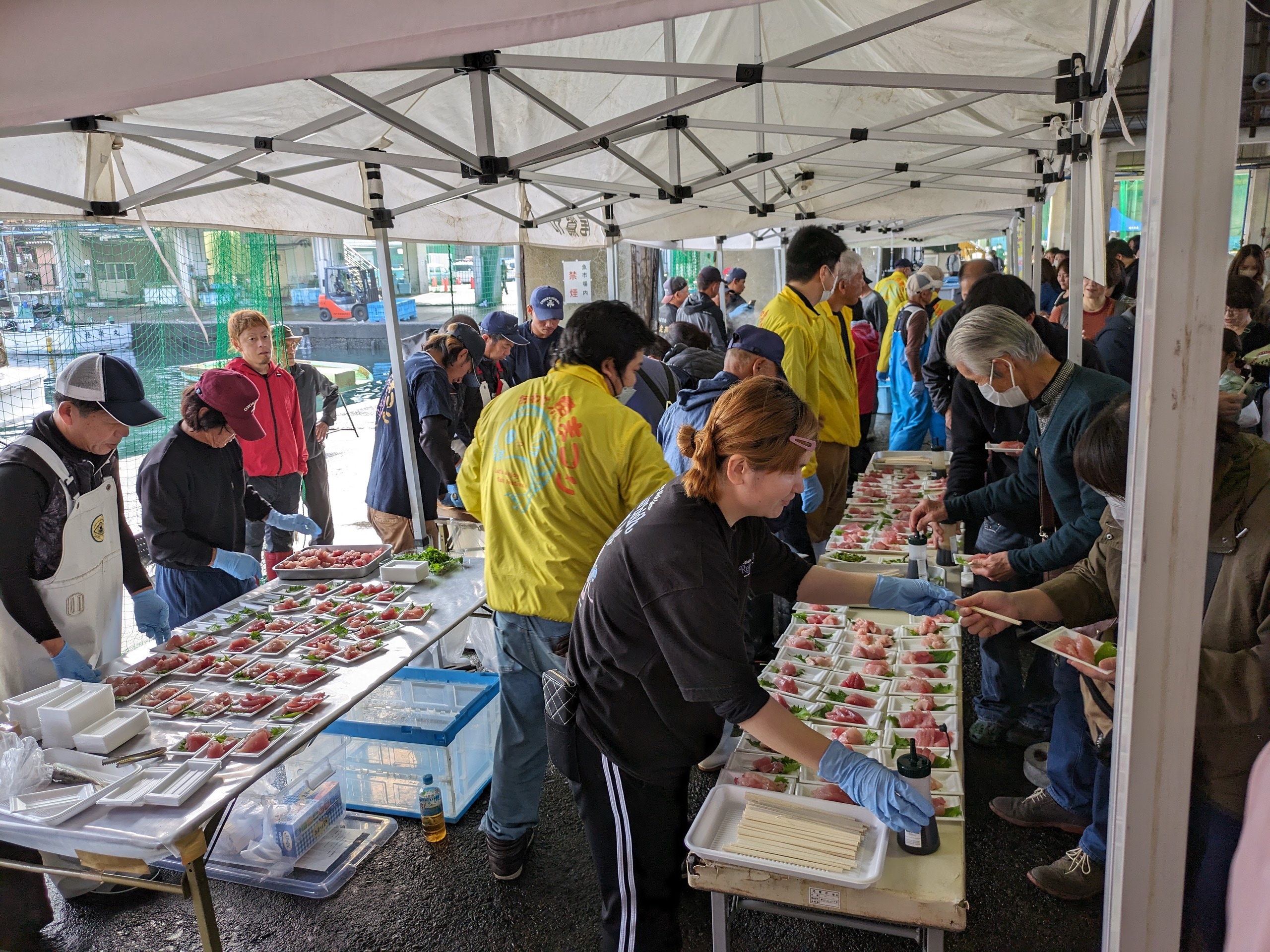 解体ショーで用いるマグロの重さを当てるクイズをします。投票形式で行い、当たった人(近かった人)にマグロブロック等豪華商品をプレゼント。