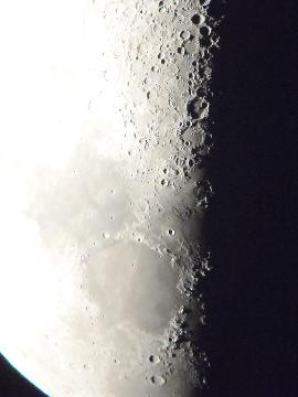 8月24日(金)、いつものように天文館で観望会を開いていました。お客さんも一段落し、手持ちの小型デジカメで上弦の月を撮っていました。再生してみるとびっくりするくらいよく写っており、天体写真は腕でもカメラでもなく空の状態なんだなぁ、と納得していました。43年前、アポロ11号が人類初の着陸をした「静かの海」もよく写っています。着陸地近くの「ザビーネD」という小型クレーターも確認しました。10枚写してそのまま帰りました。