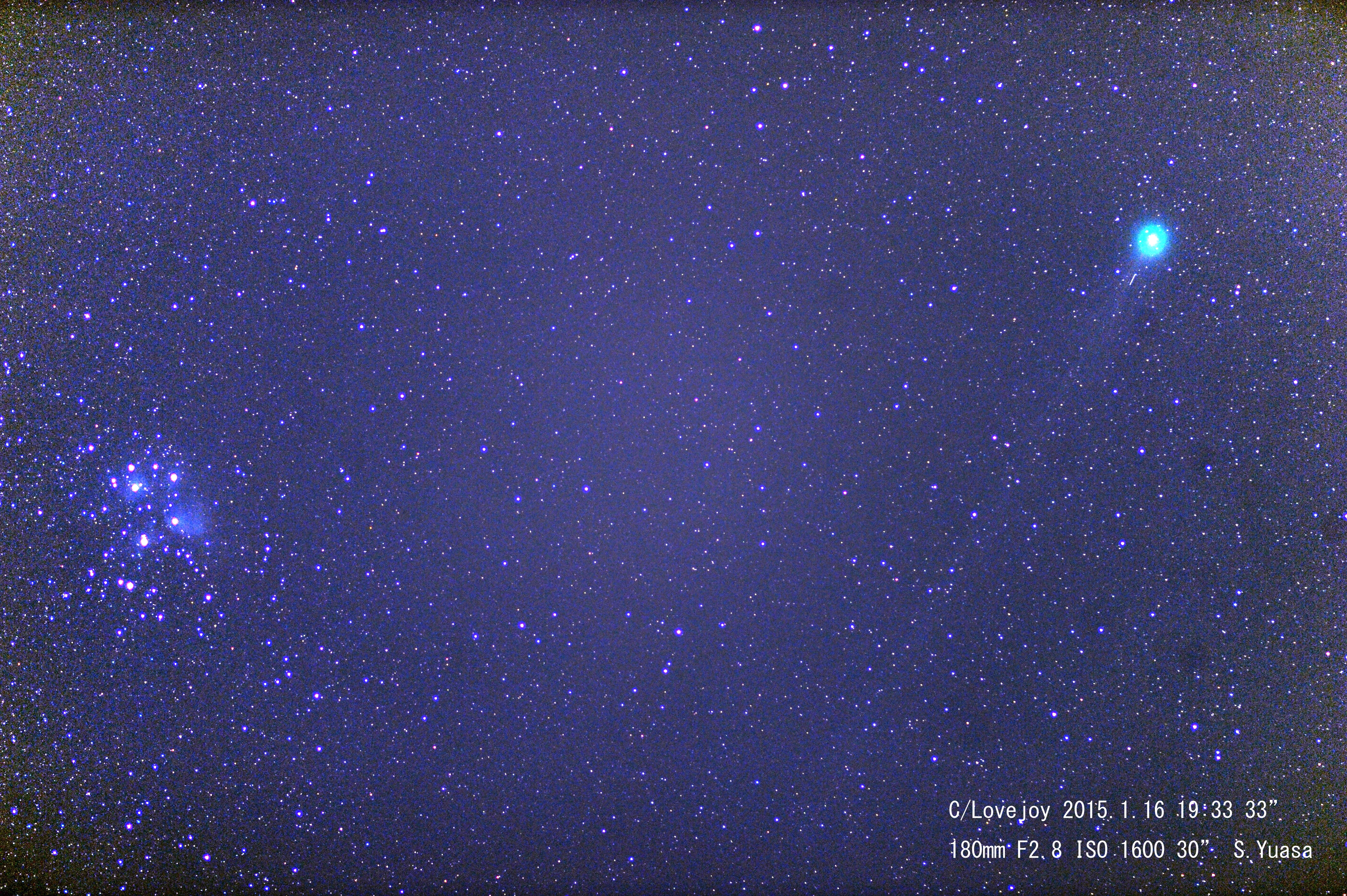 ラブジョイ(Loveloy)彗星も西に傾いてきました。アンドロメダ座大星雲の上(東)に見えており、双眼鏡で確認することができます。ここまで見やすく、しかも時間的に無理がない彗星は優等生といえるでしょう。尾(イオンテール)に変化があり、楽しむことができました。