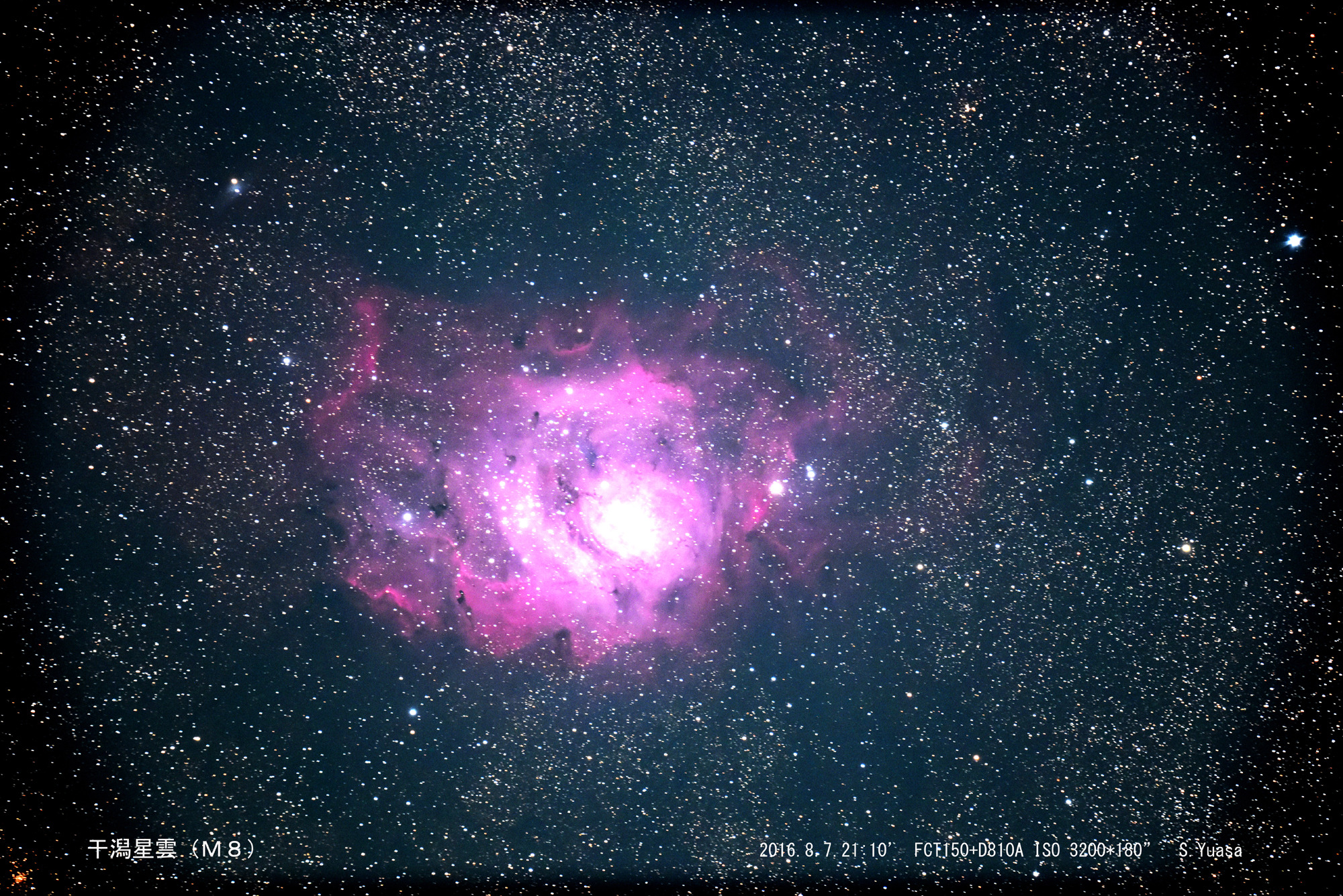 三裂星雲のすぐ南1.5°にある散光星雲で、見かけの直径は満月に近い25’、距離は3900光年です。このことから干潟星雲と三裂星雲は直接関係のないことがわかります。