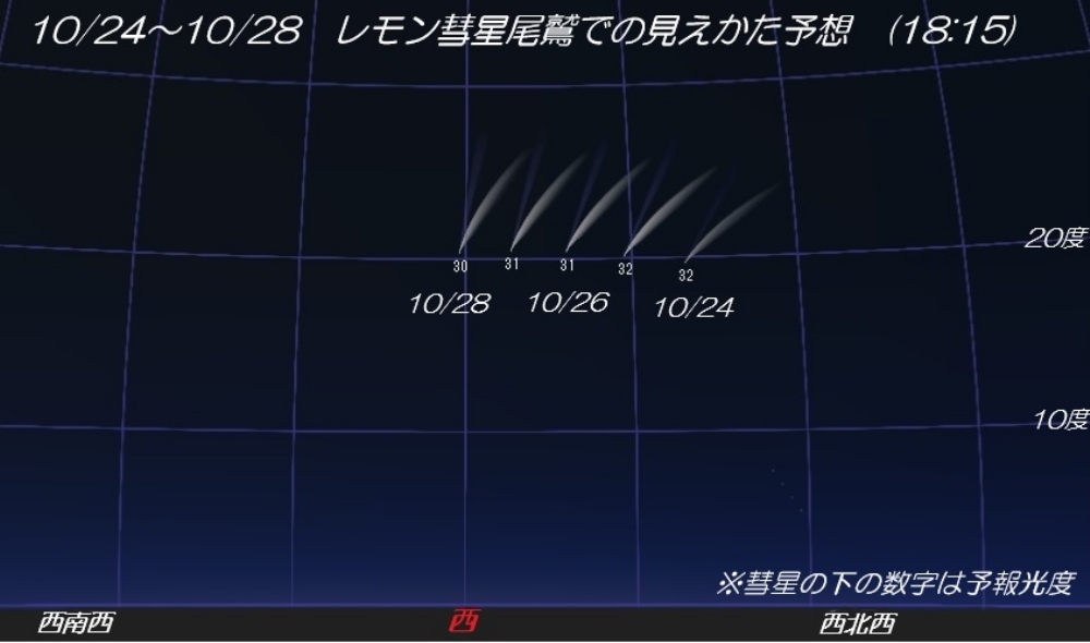 2025年1月3日アメリカのレモン山天文台で発見されたレモン彗星。その周期は非常に長く約1000年以上となる長周期彗星です。いま現在、明け方の東天で見えていますが、10月中旬より夕方の西の空に見えはじめます。10月21日に近地点(地球に一番近づく日)をむかえこのころから、肉眼でなんとか見える3~4等星ぐらいには明るくなるとの予報です。