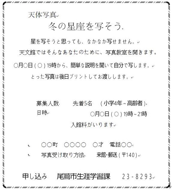 これから月の出ていない夜、皆さんに星座写真を撮ってもらうイベントを、数ヶ月に一回企画します。
