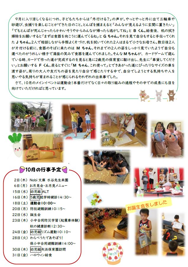 - 保育園から小学校・中学校までの一貫とした教育環境を十分に活用し、子どもが地域とともに愛情豊かに成長するよう務めることを目的とする。
