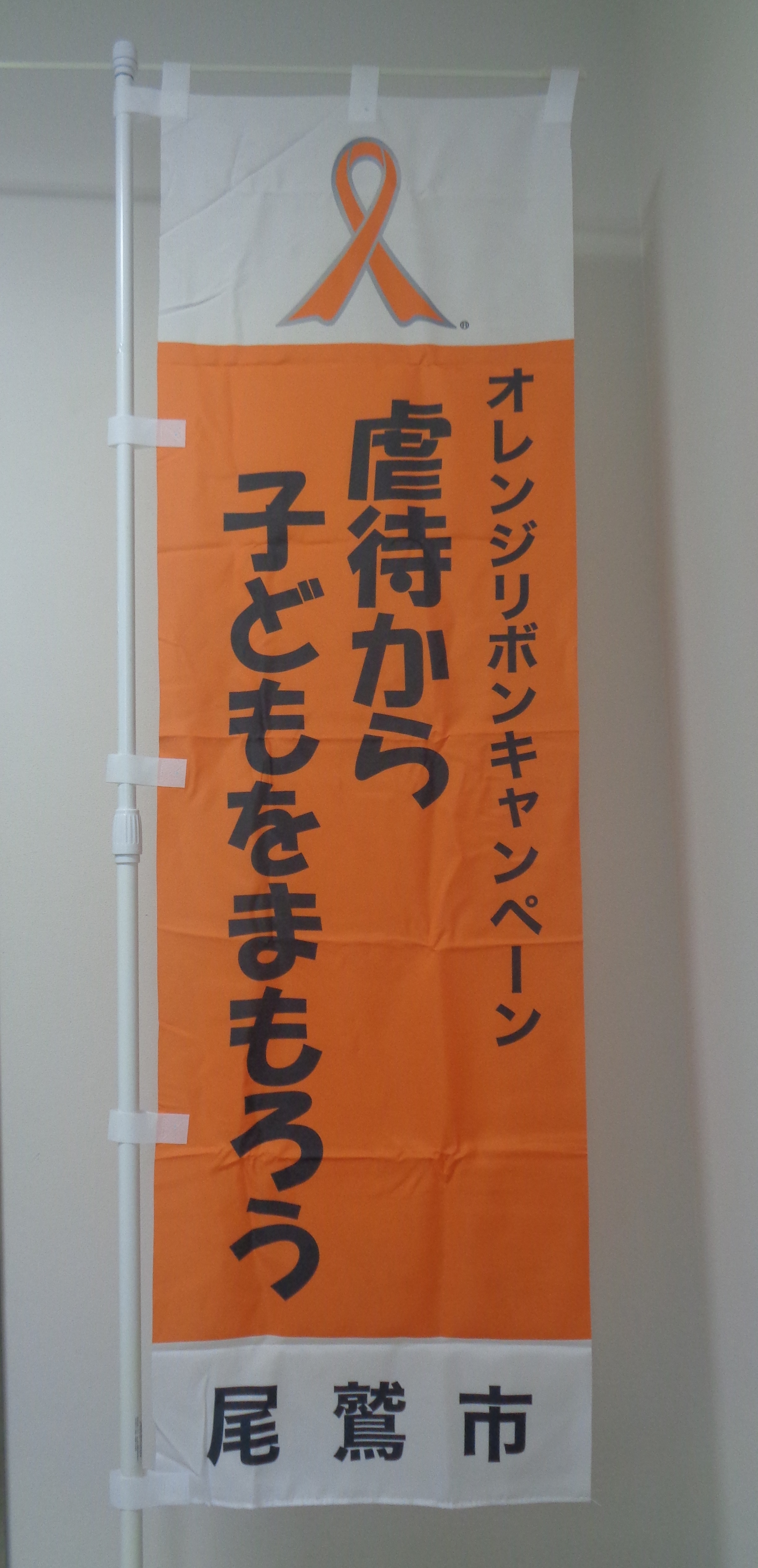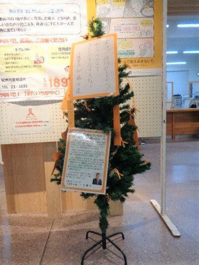 市でも、月間中、市役所正面玄関に、虐待防止メッセージを掲げたオレンジリボンツリーを展示して、虐待予防の呼びかけを行います。