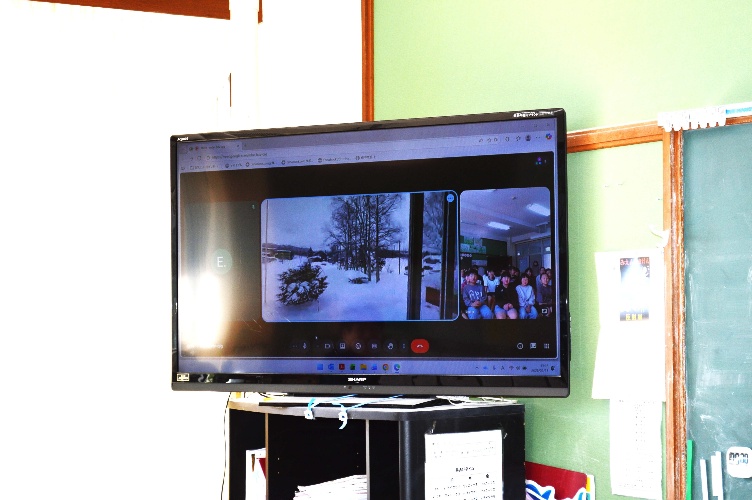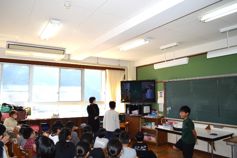 【歌登小学校とのオンライン交流会を行いました】2月13日(金)、北海道枝幸町立歌登小学校とオンライン交流会を開催しました。歌登小に勤務されている榎本先生は、いつもトチ餅づくりでお世話になっている地域の方の甥にあたります。お正月に帰省した際、トチ餅を持ち帰り、担任している3・4年生に食べさせたところ、「トチ餅についてもっと知りたい」という声が上がりました。そこで、トチの学習をしている賀田小学校へご連絡をいただき、今回の交流が実現しました。交流会では、賀田小学校の1~4年生が学校紹介、6年生がトチの学習発表を行いました。歌登小学校からは、今年度の全校児童が28名であること、ゴールデンウィーク頃に桜が咲くこと、給食に毛ガニ入りの汁物やホタテラーメンが出ること、1月・2月にはスキーの授業があることなどが紹介され、地域の特色を知る貴重な機会となりました。子どもたちからは驚きの声も上がり、遠く離れた地域の生活や文化を知る良い学びとなりました。今回の交流をきっかけに、来年以降も継続して交流を深めていく予定です。(TVに映る雪景色は、交流会当日、歌登小の教室から見た風景です。)