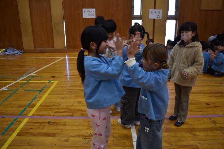 【昔の遊び交流(1年生)】1年生が、来年度入学してくる保育園の人たちを小学校に招待して、生活科で勉強した昔の遊びを教えました。