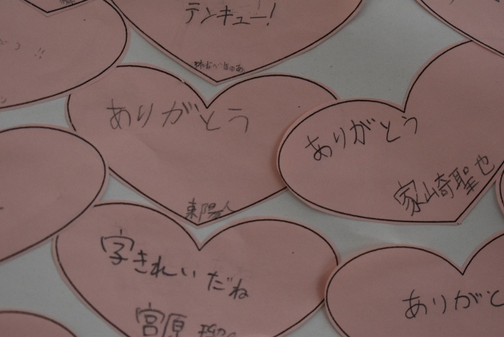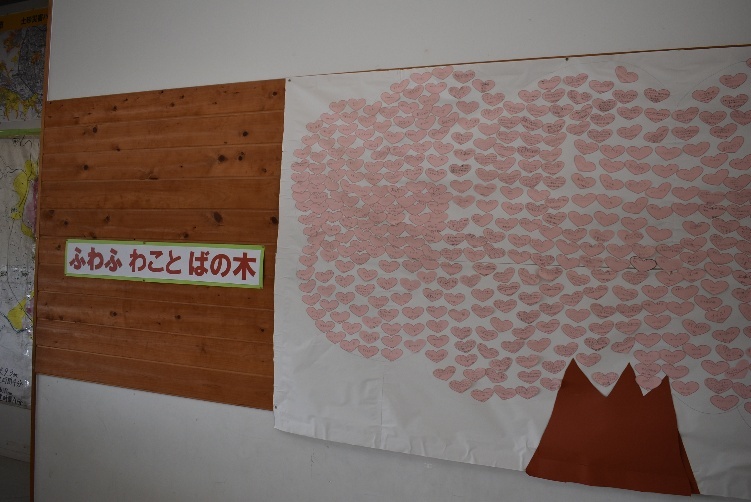 - みんなでふわふわ言葉を使ってうれしい気持ち・楽しい気持ちになろう。そんな願いをもって1年間取り組んできました。3学期はその言葉をピンクのカードに書いて一本の木のイラストに貼り付けました。