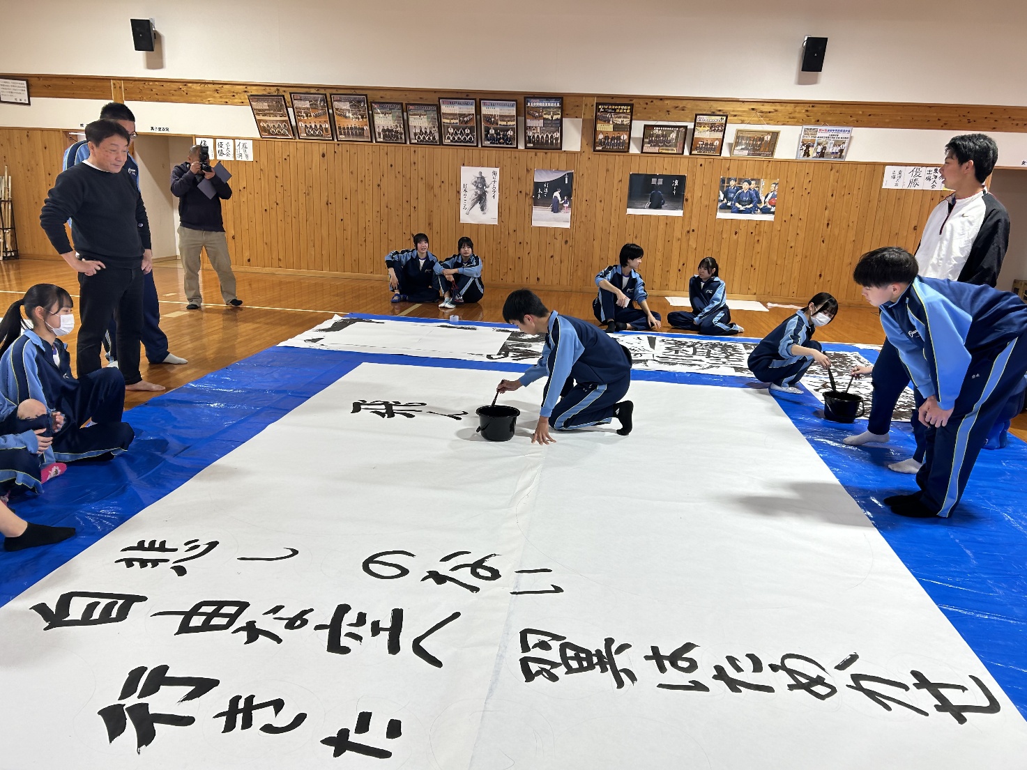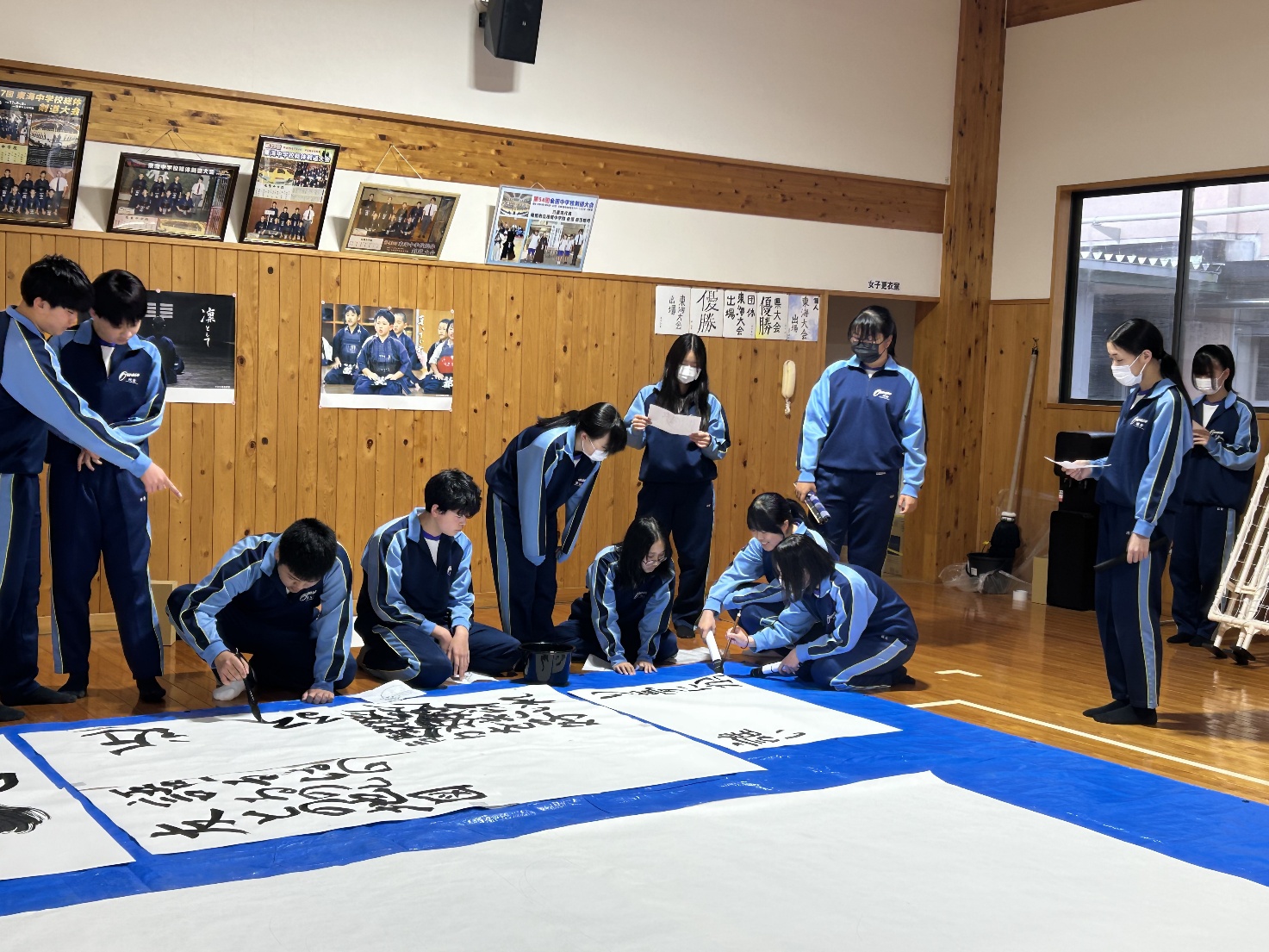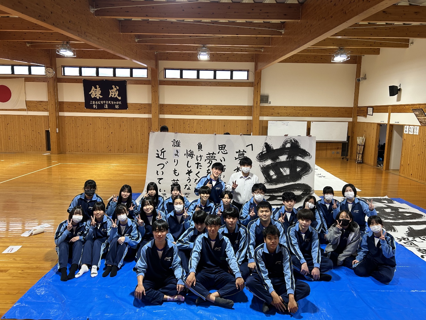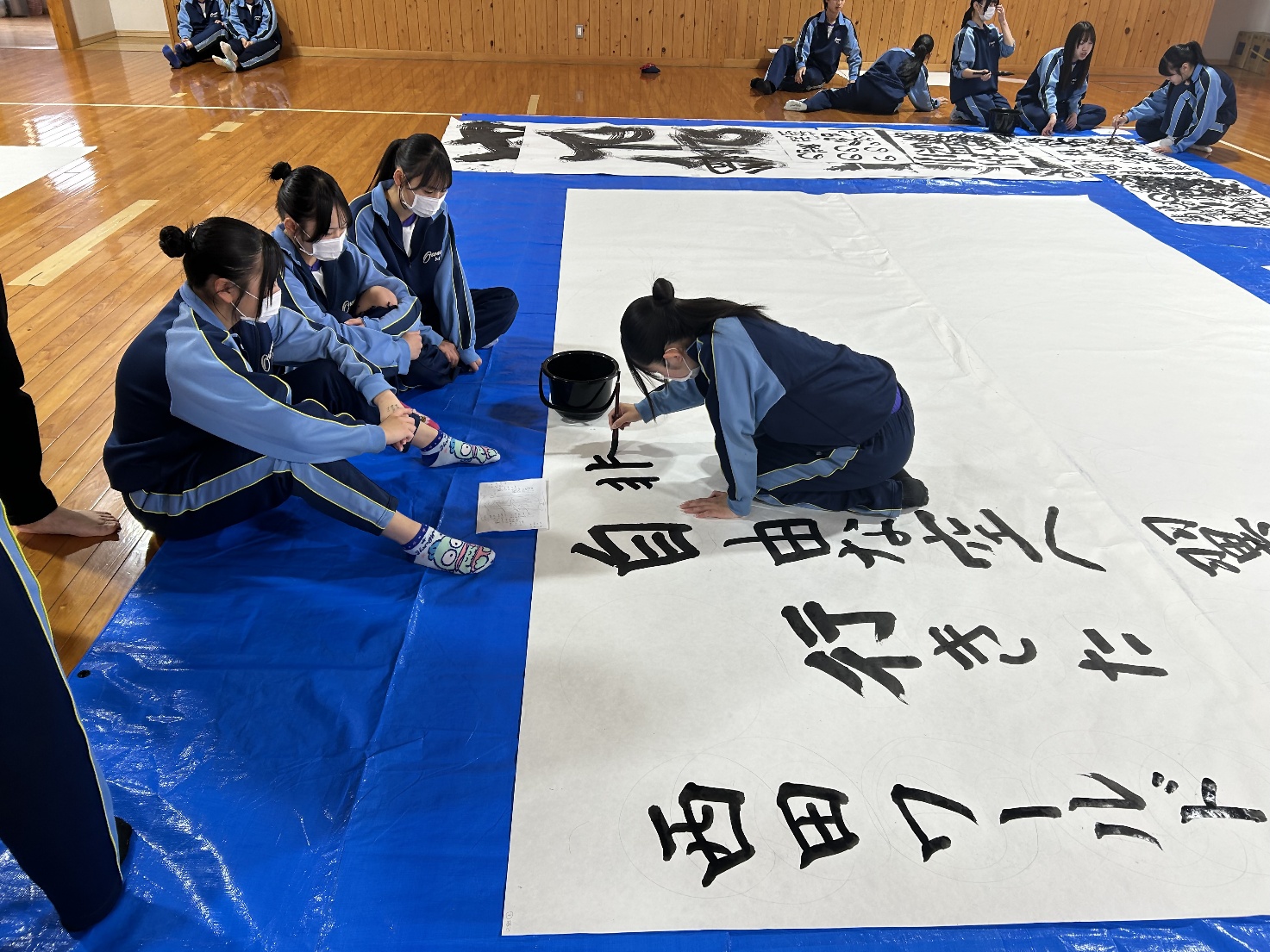 2月25日(水)・26日(木)の2日間、3年生が国語科の授業で「Big書道」に取り組みました。各クラスごとに「夢」「飛翔」「未来永劫」などの文字をテーマとし、縦3メートル・横4.6メートルの大きな紙いっぱいに、歌詞やメッセージとなる言葉を添えて作品を制作しました。完成した作品は、卒業制作として卒業式当日の会場に掲示する予定です。迫力ある書とクラスの思いが込められた、世界に一つだけの作品となりました。
