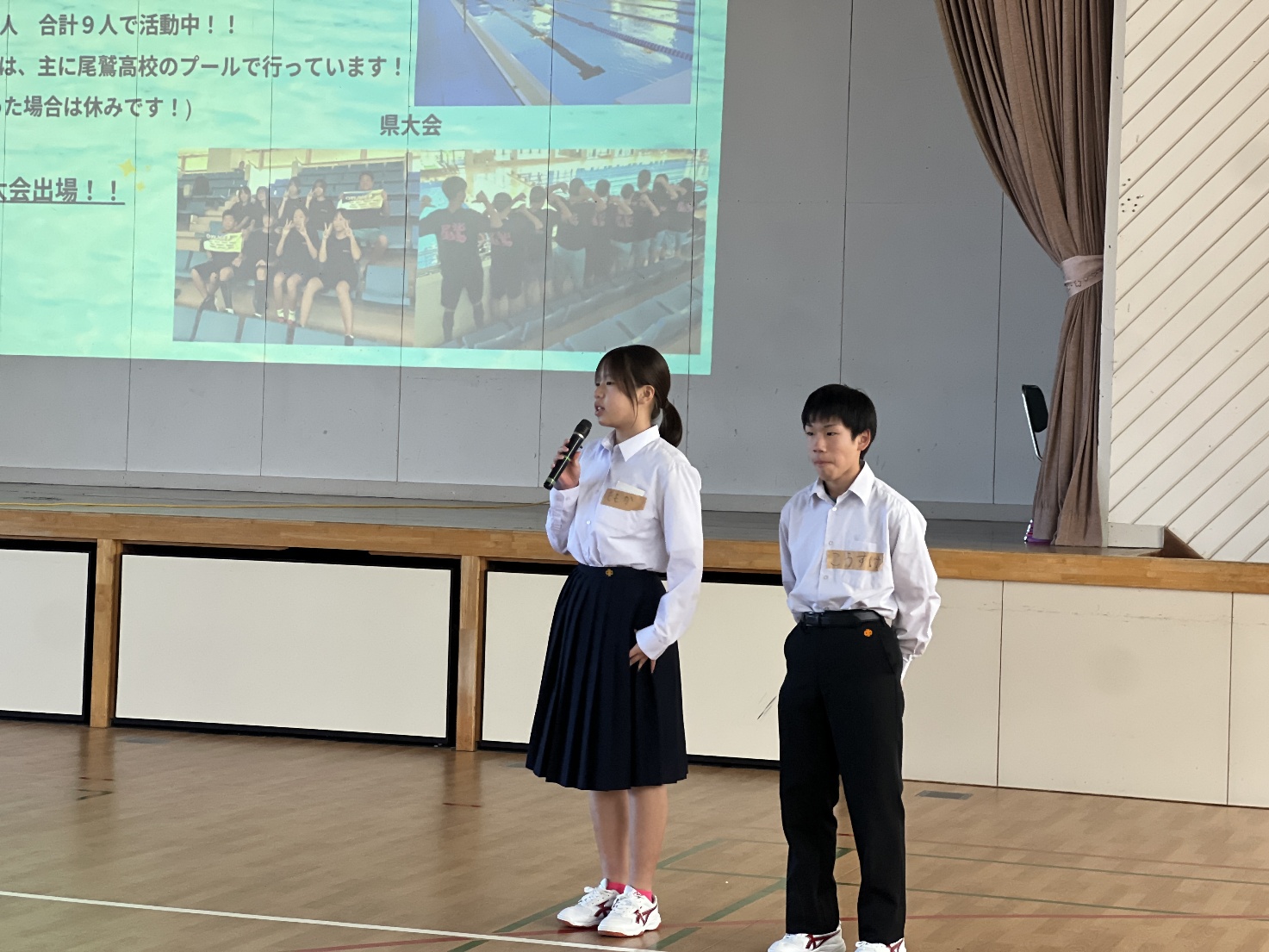 当日の企画・運営は、尾鷲中学校1年生の室長会の生徒が主体となって行いました。はじめに、中学校の生活や特色についての学校紹介、続いて各部の活動内容を紹介する部活動紹介を行い、小学生のみなさんに中学校生活の様子を知ってもらいました。