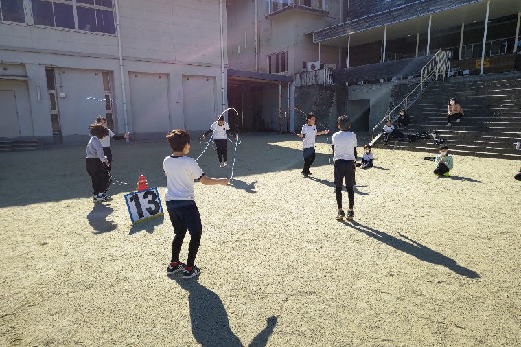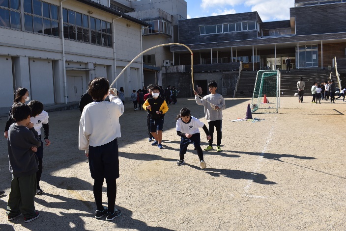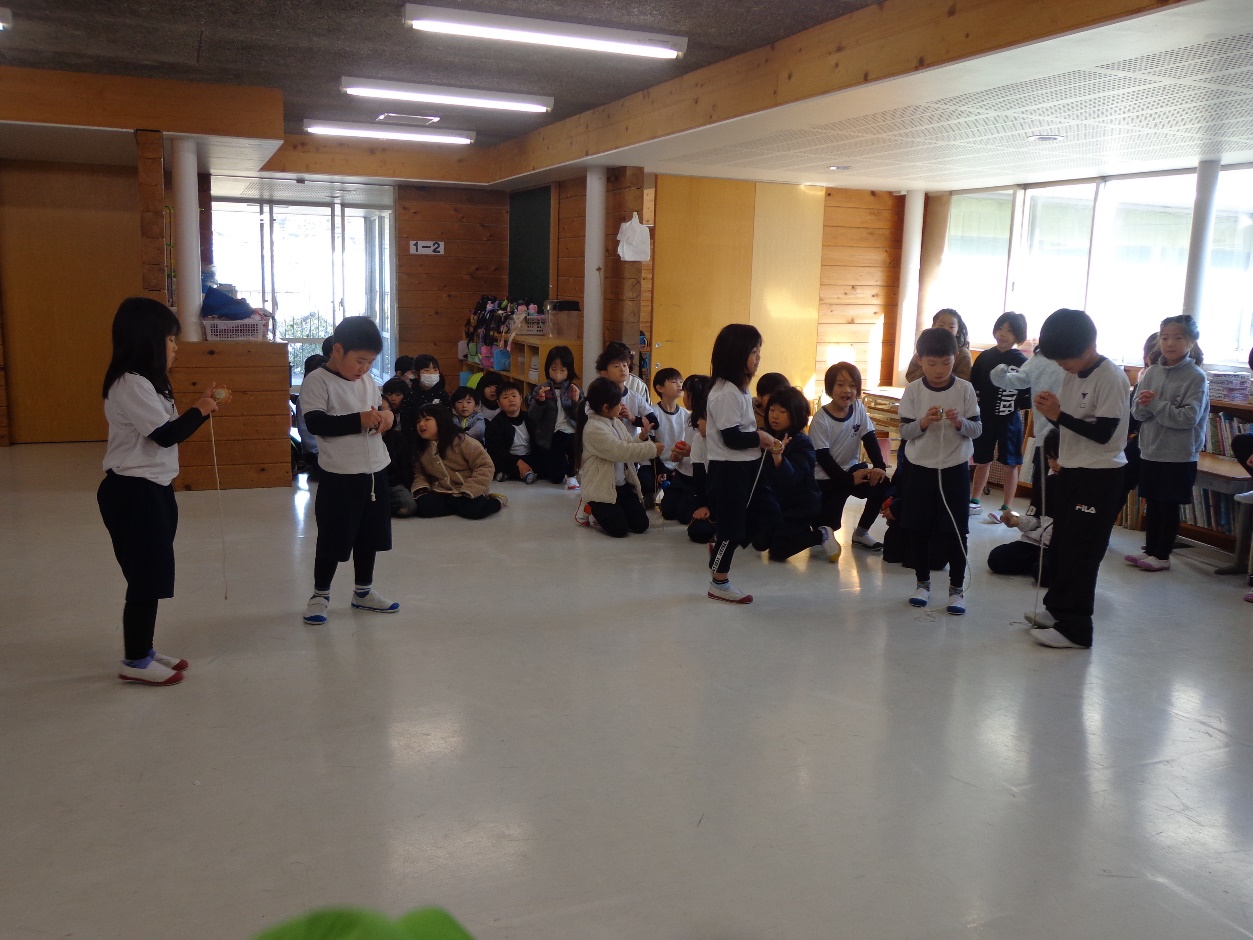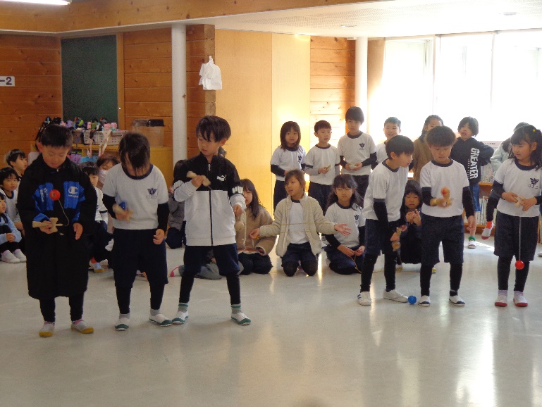 1年生「むかしのあそび」発表…保育園のみなさんに練習した技を見てもらいました。
