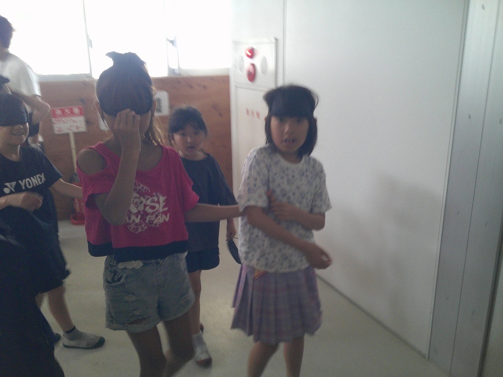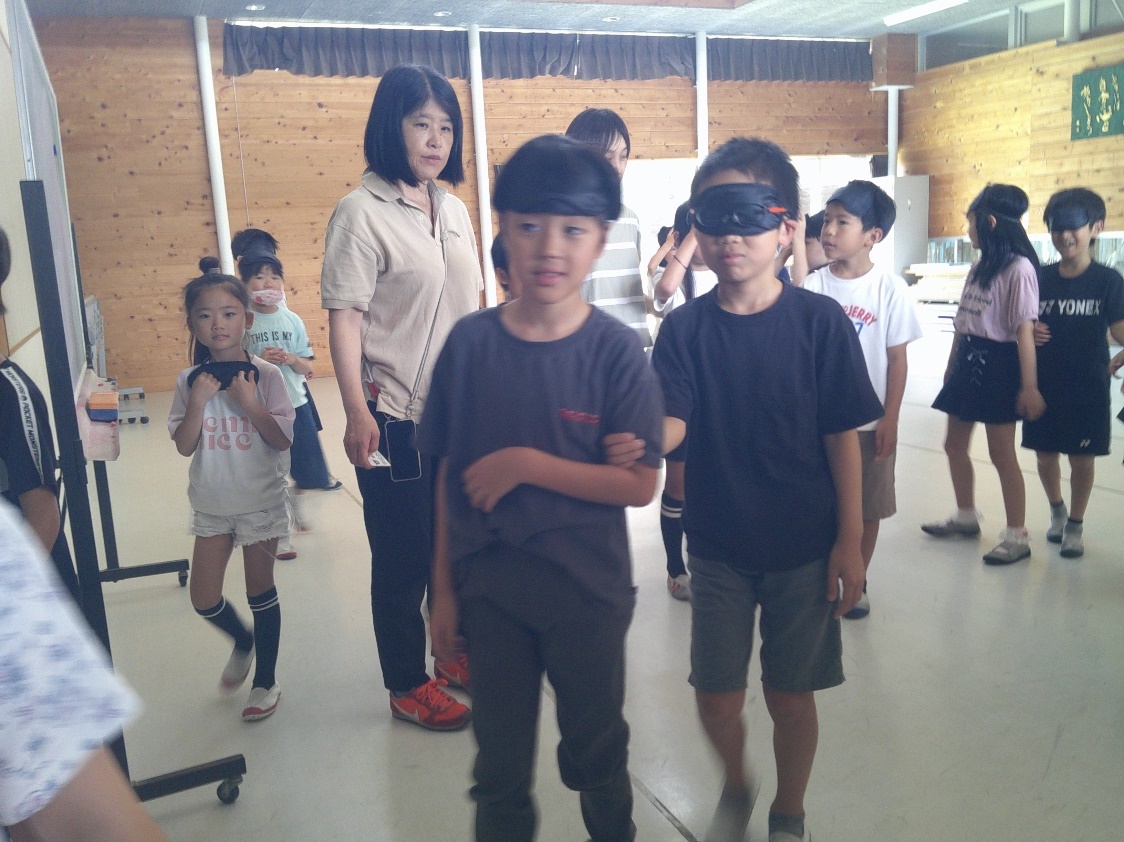 尾鷲小学校3年2組の児童25人が7月1日、福祉学習で視覚障害について学びました。尾鷲市社会福祉協議会の職員の話を聞いた後、2人1組になり、交代でアイマスクを付けて友だちの腕をつかんで誘導し、20メートルほど歩く体験に取り組みました。目のいろいろな働きについて聞いた後、視覚障害について学習しました。