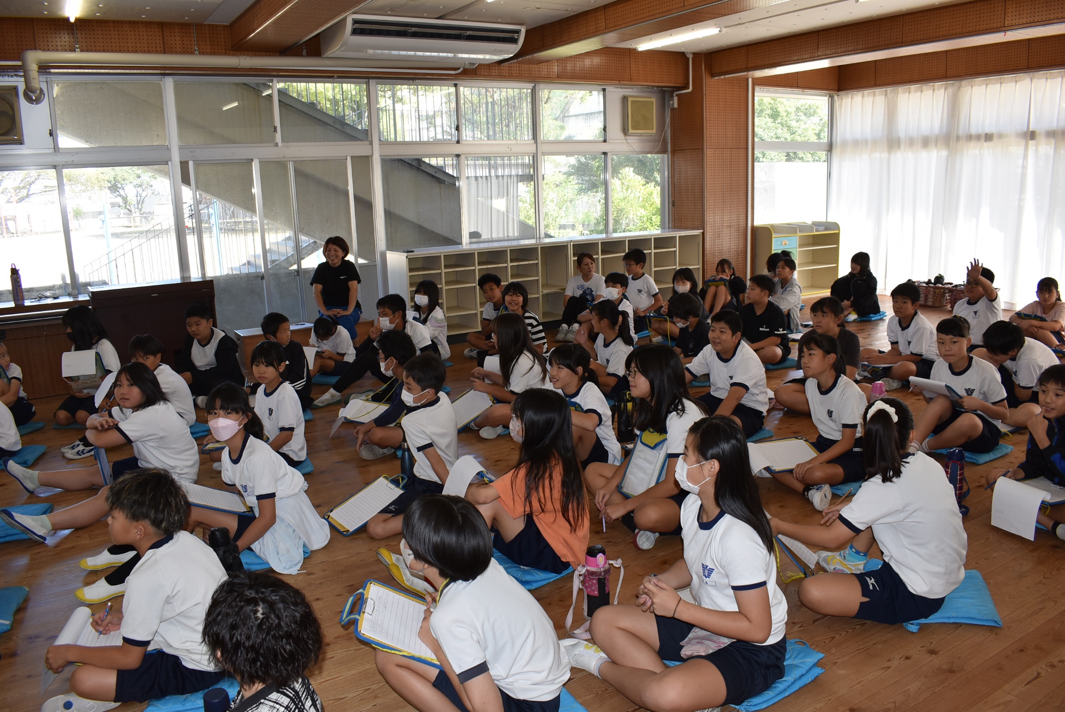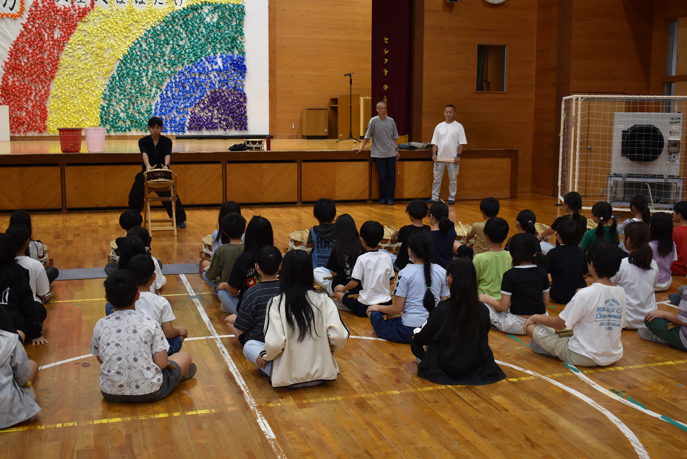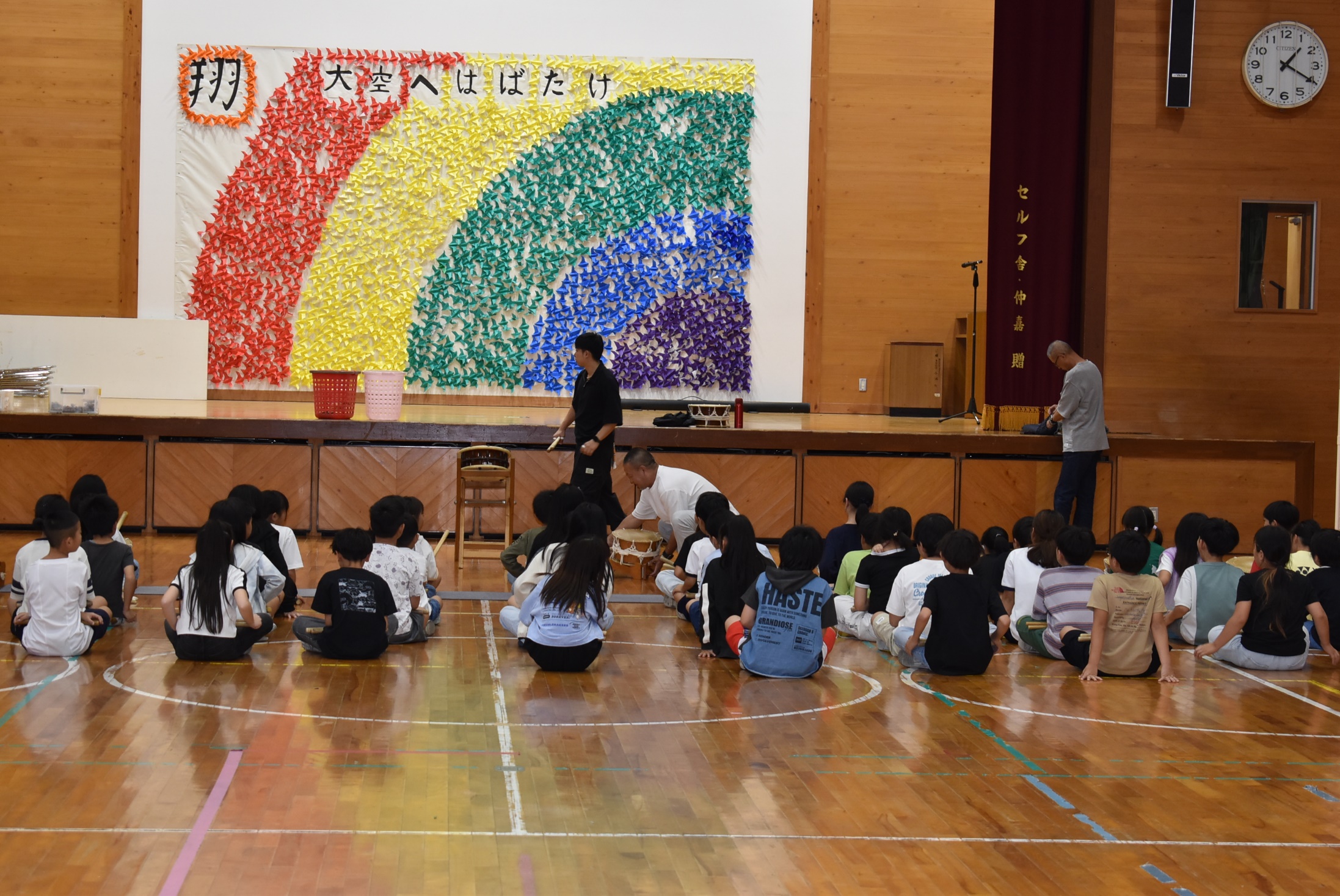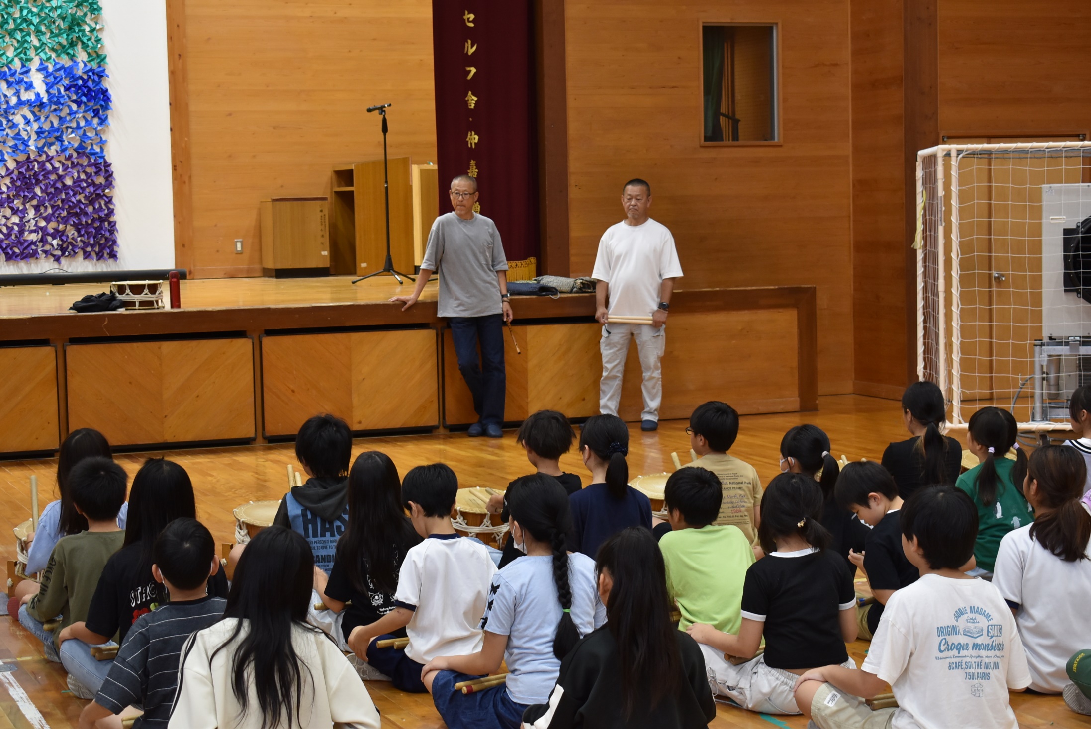 今年も始まりました。4年生「太鼓の学習」です。尾鷲小学校は濱野さん・小倉さんに毎年ご指導をいただきます。小太鼓のリズムが学校中に響きます。