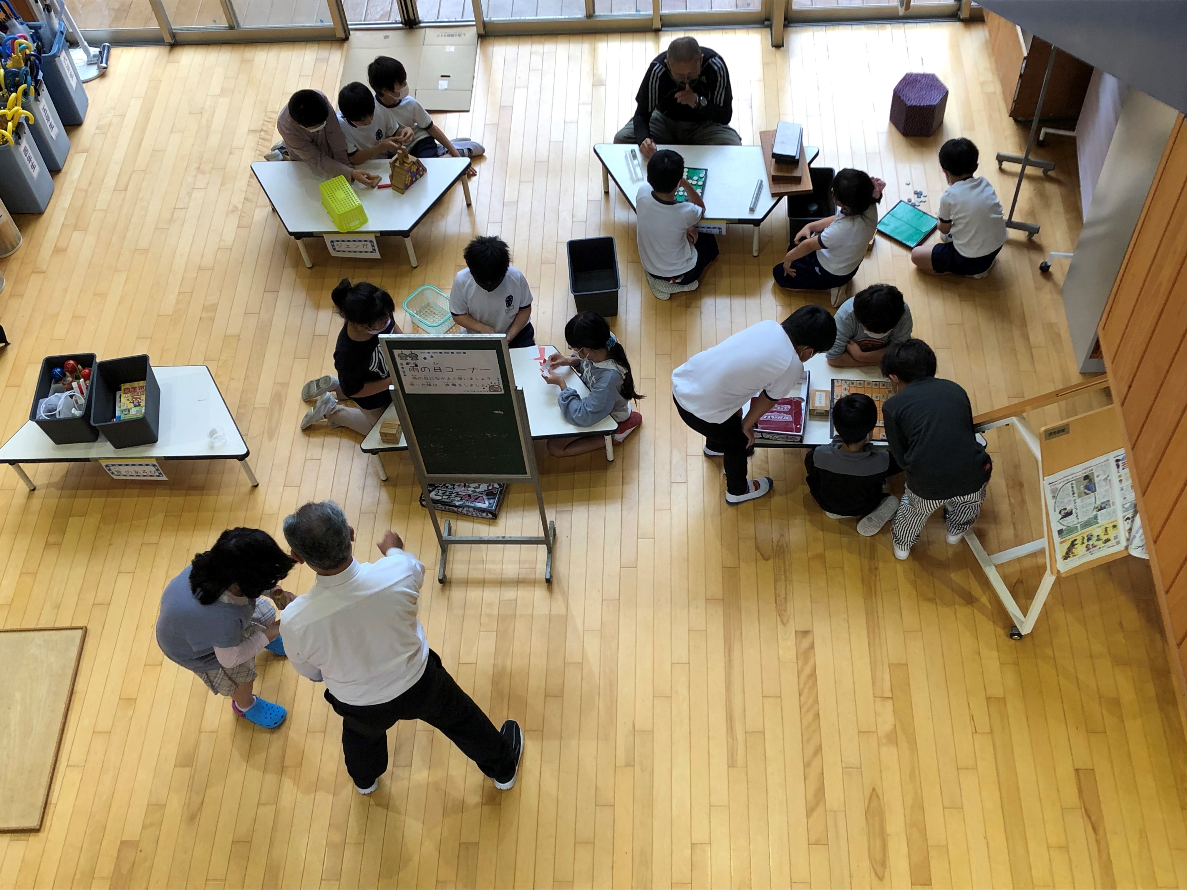 「けん玉」「おはじき」「将棋」「オセロ」「こま」「ジェンカ」「トランプ」などをみんなで交代しながら、密にならないように気をつけて、楽しく遊んでいます。