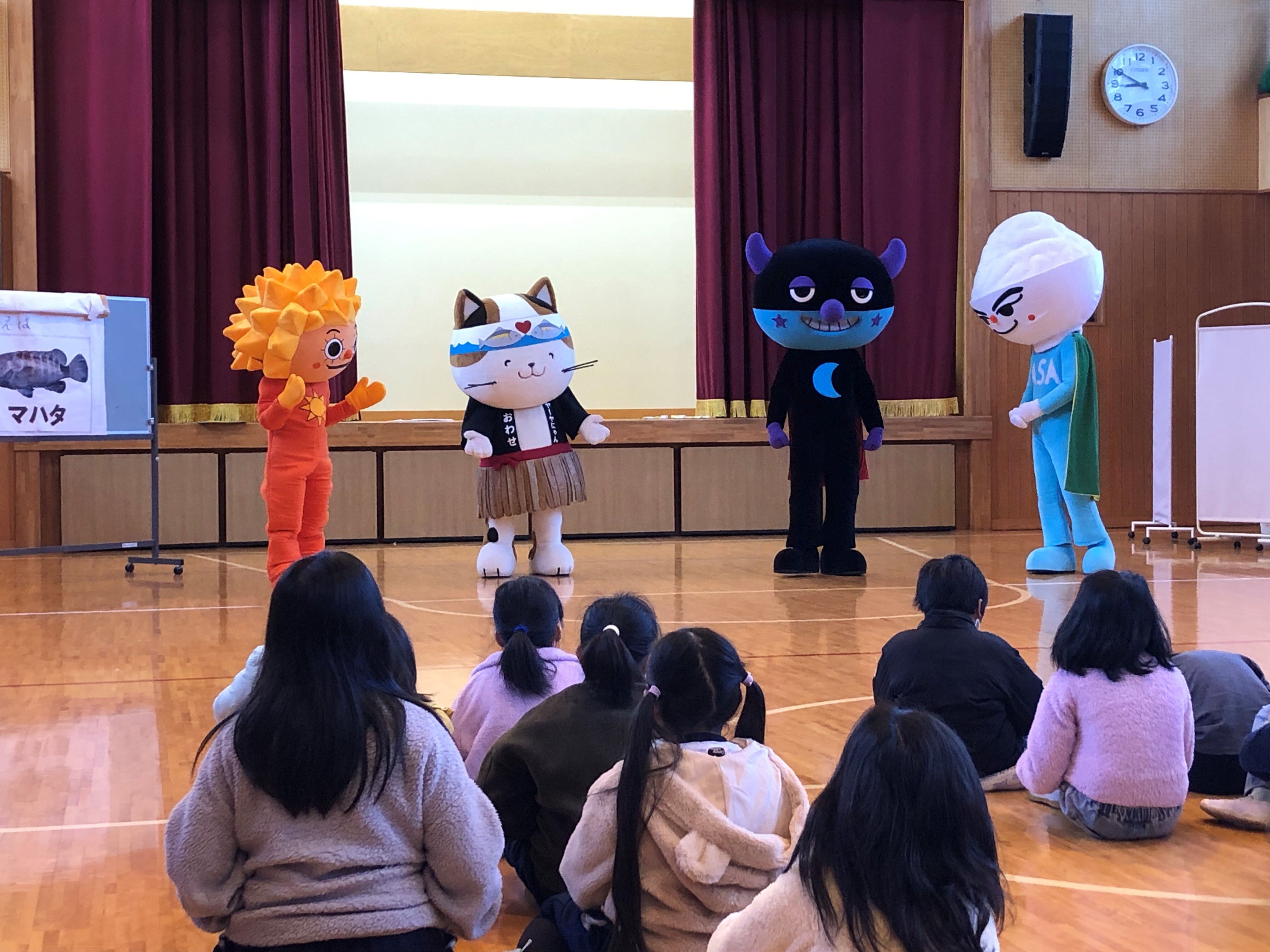 先日、「にこにこ劇団」による生活習慣の劇がありました。劇の中で、「朝ごはんは1日の始まりで、元気が出る。」「ノーメディアデーに取り組もう。」などといったメッセージを発信しました。 また、「尾鷲市の魚に指定されている魚は何ですか?」というお魚クイズもありました。この劇を通して、早寝早起きや朝ごはんの大切さ、スマートフォンやゲームの正しい利用について学び、行動につなげてほしいと思います。