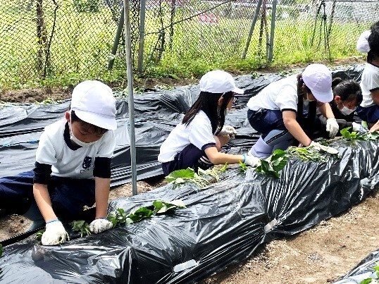 5月10日(水)、全校で紅あずまの苗を約200本植えました。事前に6年生が畑を耕し、畝を作り、マルチを張ってくれました。さらに下級生が上手に植えられるように、手順やポイントを分かりやすく説明しました。おかげで全校児童が、楽しくスムーズに活動できました。秋の収穫が楽しみです。