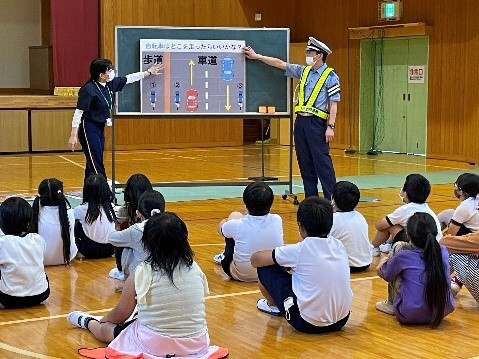 5月25日(木)、尾鷲警察署、交通安全協会の方に来ていただき、1,2年生は横断歩道の渡り方、3~5年生は自転車の乗り方を教えていただきました。1,2年生は体育館でお話を聞いた後、実際に学校前の横断歩道で一人ずつわたる練習をしました。3~5年生は、自転車の正しい乗り方や点検方法を教えていただきました。