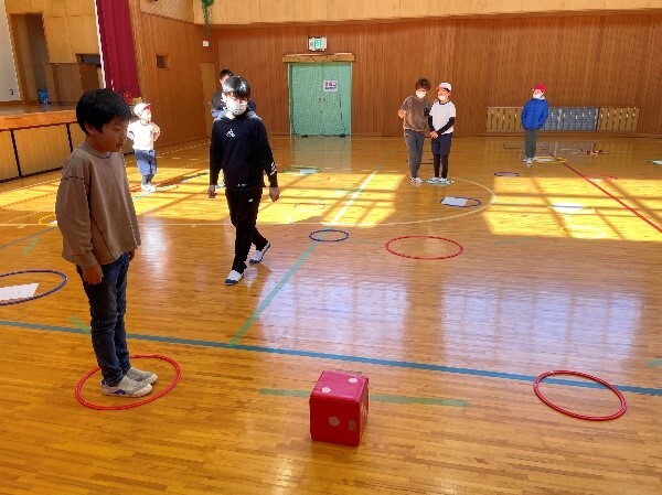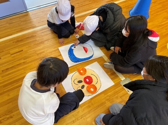 後期児童会は、様々な活動を企画しています。1月は「正月あそびを楽しもう」を計画しました。福笑いや凧あげ、人間すごろくをはじめ、コマやけん玉、だるま落とし等を昼休みに縦割り班で楽しんでいます。
