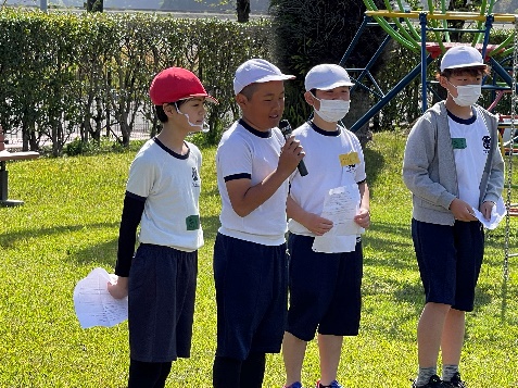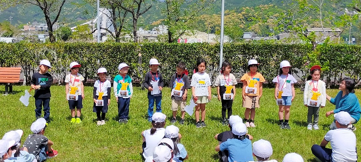 4月19日(金)、春の遠足に全校で中部電力尾鷲三田工事所内の公園に行きました。今年はそこで6年生主催の1年生を迎える会をしました。し1年生が一人ひとり自己紹介した後、「だるまさんがころんだ」や「ころがしドッチ」など交流しました。縦割り班で弁当を食べるなど、縦のつながりを大切にした行事でした。