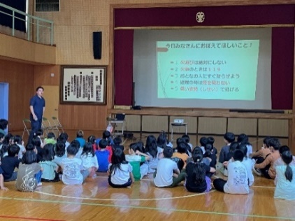 5月24日(金)、尾鷲市防災危機管理課の方を講師にお招きし、全校で防火学習をしました。「火事を起こさないために」「火事を発見したら」「火事から逃げるには」などの観点でお話していただきました。1月1日に起こった能登半島地震へ支援に行かれた時の様子についての話も聞かせていただきました。地震だけでなく火災の恐ろしさもしっかり学ぶことができました。