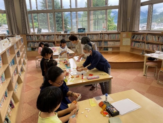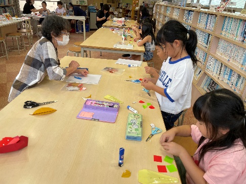 9月10日(火)、1年生が、図書ボランティアさんと図書館司書の西川先生の指導で折り紙教室をしました。1学期に続き3回目になる今回は、「秋」をテーマにキノコやイチョウの葉などを作って台紙に貼りました。2学期から図書ボランティアさんが一人増え3名になったので、一層ていねいに指導してくださっています。3学期に「冬」の作品をつくり、1冊の本に仕上げます。