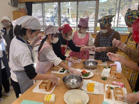 1月22日、6年生が天満百人会の出口さんと中野さんを招いて、こけら寿司づくりに挑戦しました。こけら寿司とは、お祝い事のときなどに作られる押し寿司のことです。今回、家庭科「家庭、地域の一員として」の学習で、地域に伝わることを聴き、体験することを目的に実施しました。材料を切ったり、酢飯をつくったり、押し寿司の木枠に材料を詰めたりなど、貴重な体験ができました。