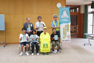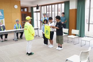昼休みに、本校のスクールガードの川口千佳子さんをお迎えして行いました。「ハンドサイン」とは、横断歩道を渡るときに、運転手に顔を向けたり、少し手を挙げたりして横断するという意思表示をする行動です。ハンドサイン旗には、「手をあげよう。」「止まってくれたらお礼をしよう。」「にっこりえがおでハンドサイン!!」というメッセージを書き、通学路で見守り等を行ってくださっているスクールガードさんに日頃の感謝もお伝えして、児童会役員の橘山丈嗣さん、清水瑛介さん、西野智陽さんの3人からお渡ししました。全校児童60名には、交通安全の面では「ハンドサイン」を意識した生活を送らせたいと思います。