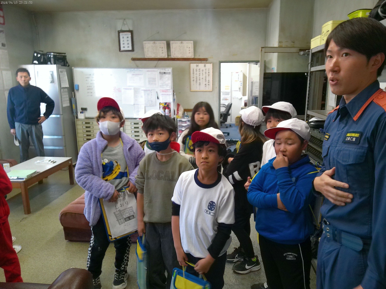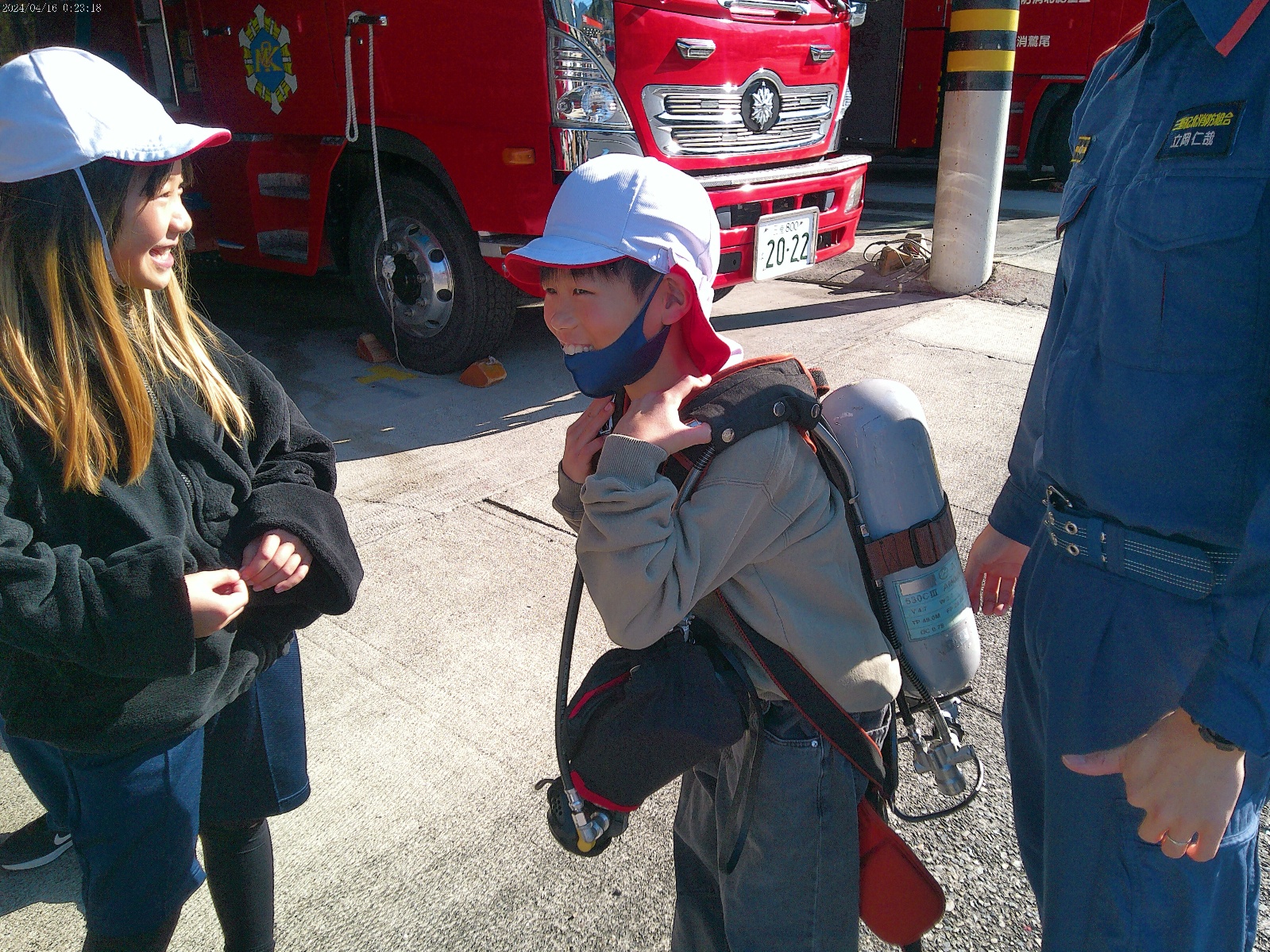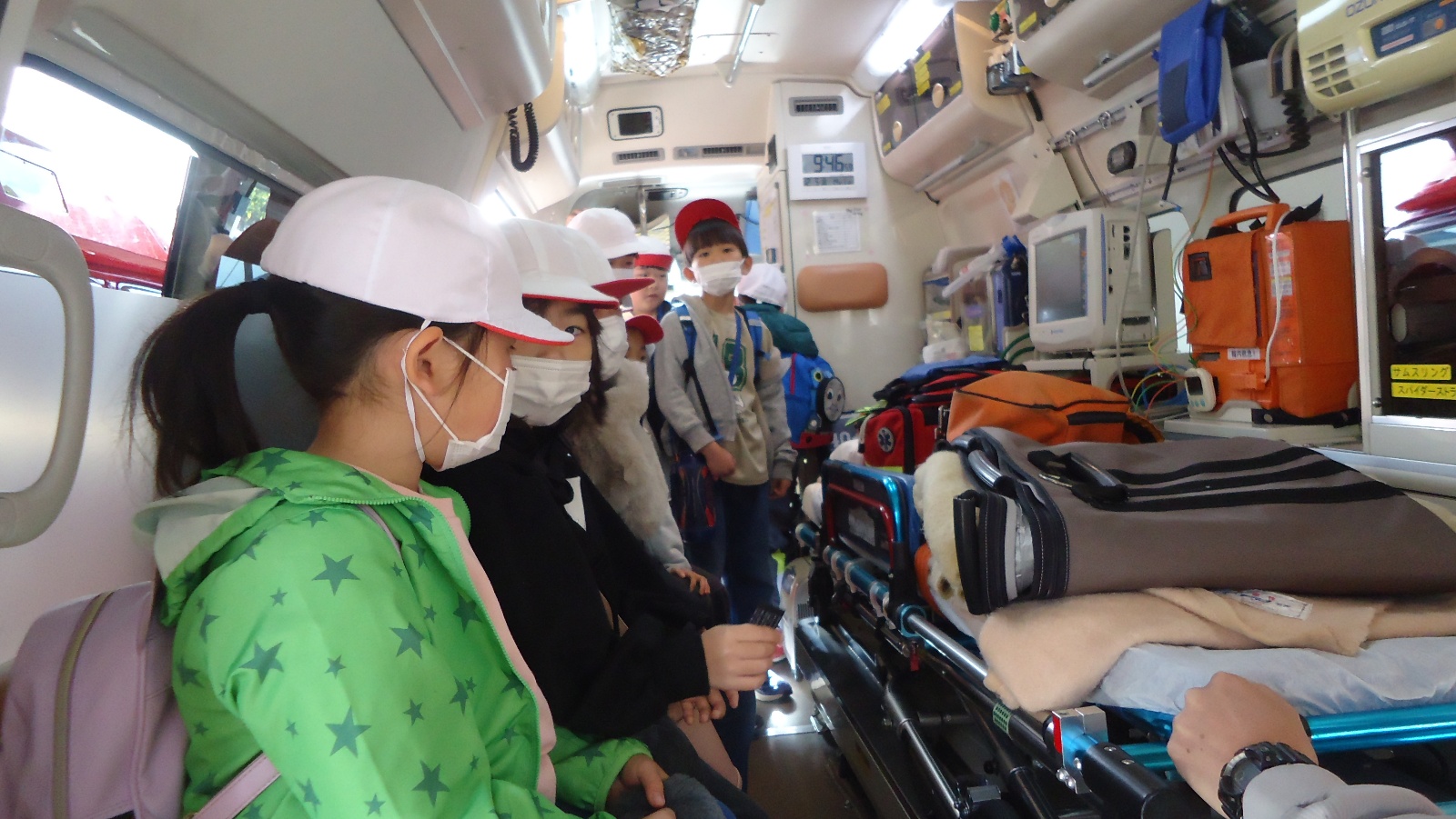 子どもたちは、24時間勤務なので食堂やお風呂、仮眠室があることに興味津々だったり、通信指令室に入らせてもらい、火事が起きた住所を入力するとその場所が地図で表示され、そこに住んでいる方のお名前が出てくることにびっくりしたりしていました。また、救急車の中や消防車の運転席や助手席に乗せていただいたり、各種消防車の装備を見せてもらったり、酸素ボンベを担がせてもらったりしました。見学の最後には質問の時間を設けていただき、一人ひとりの質問に丁寧に答えていただきました。
