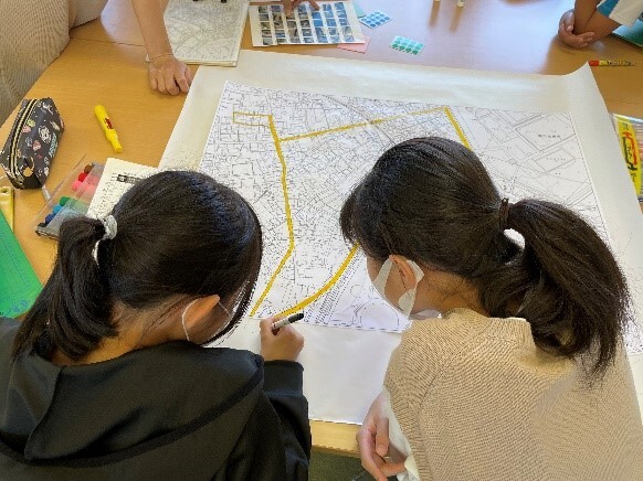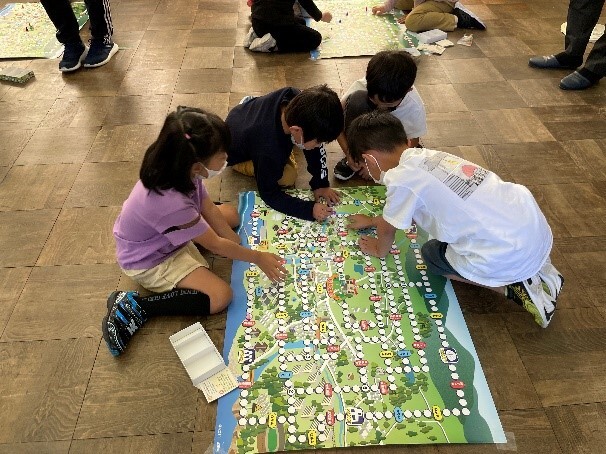 中学年は、液状化の仕組みと実験、避難所での行動を考えるワークをしました。高学年は、4グループに分かれて校区を歩き、「危険なもの」「安全な場所」「役に立つもの」をさがし、マップ上に記録しました。それらを持ち寄って「防災マップ」として仕上げました。