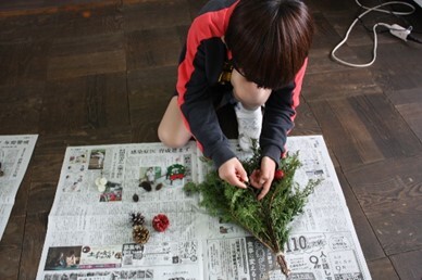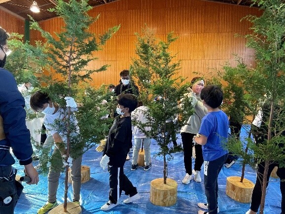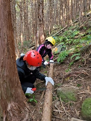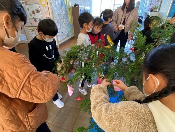11日には、6年生が市有林へ行き、間伐やヒノキの水分測定を体験しました。切った木を学校へ持ち帰り、丸太で工作をする予定です。葉は、3,4生がリースとして、1,2年生がクリスマスツリーとして活用しました。