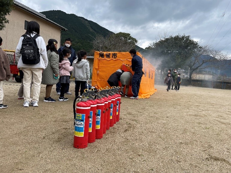 12月21日(水)、尾鷲市防災危機管理課の方々にご協力いただき、火災を想定した避難訓練をおこないました。 マスクの上からハンカチで口を押え、真剣に避難できました。 避難後は、運動場で煙体験と消火器体験をしました。お話の中で、『助けを呼ぶ』ことの大切さを教えていただきました。