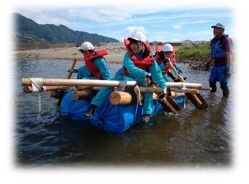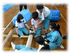 12日(火)には、本校体育館にて、6月に市有林「みんなの森」で伐採した間伐材(6月26日発行「やのはまっ子・第6号」参照」)を使っての筏づくりを行いました。始めにロープワークのやり方を教わった後、グループに分かれて、自分たちが作った設計図に基づいてオリジナル筏の作製に挑んだのですが…。これがなかなか難しい。木材と木材をうまくロープでつなぎとめることができず、途中で「ほどいてやり直し」になったり、結んだロープがすぐに緩くなってしまい「分解寸前」の状態になってしまったり…と悪戦苦闘の連続でしたが、何とか時間ぎりぎりで完成させることができました。