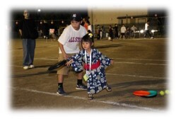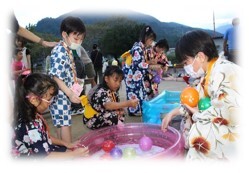 午後6時には、「子ども広場」がスタート。4~6年生の児童たちが企画・準備した射的、ヨーヨー釣り、ボウリングゲーム、輪投げ、ストラックアウト、ディスゲッター、「箱の中身は何だろな?(もの当てゲーム)」や、PTA主催のおもちゃ・お菓子の「くじ引きコーナー」などの様々な出店が開店し、「遊びチケット」を手にした1~3年生の児童や地域の親子連れの方々が、それぞれを回って楽しみました。