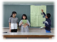 今回の「みらい育」は2部構成で、前半は、これまで取り組んできた「山育」「川育」「海育」の取組の成果を、それぞれ3つグループに分かれて模造紙にまとめ、それをもとに他の児童や観覧に来ていただいた方々(これまでの取組に親身になってご協力いただいた尾鷲藪漕隊の方々や、市の地域おこし協力隊の方々が来てくださいました)に発表会の形で報告しました。