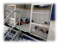 まず全校生徒が運動場で、「地震体験車・そなえちゃん」に学年ごとに順番に乗り込み、県防災対策部の山下 宏幸さんの指導のもと、南海トラフ地震を想定した震度5~7の揺れを体験しました。