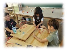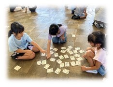 その後、県教育委員会学校防災アドバイザー・渡辺 喜内さん、大須賀由美子さんの指導のもと、1~2年生は「みえ防災すごろく、かるた」に、3~4年生はストローハウスの組み立てに取り組みました。