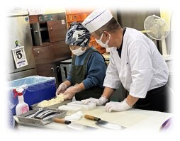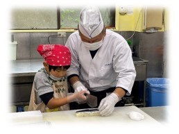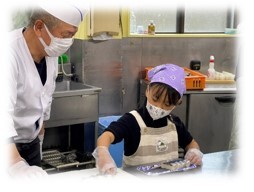 紀州の伝統料理として有名な「さんま寿司」の料理体験を、三紀さんのご協力で実施しました。最初はおっかなびっくりだった児童たちも、職人さんのご指導のもと、次第に慣れて上手く作れるようになりました。