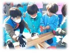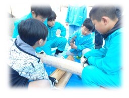 今回は、その間伐材の残りを使って、小学校に卒業記念として2基、矢浜保育園に遊具用として2基、丸太橋を作製・設営しようというもので、前号の「やのはまっ子」でも少しご紹介した通り、このプログラムを受け継ぎ、来年度最上級生として保育園児年長さんたちを迎える5年生の児童たちとともに、1月22日(月)に本校体育館で下準備を行っていました。