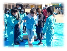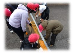 完成後、園児たちは、おっかなびっくり両手でバランスをとりながら、何度も橋渡りを楽しみ、最後に「おにいさん、おねえさん、どうもありがとう‼」と、大きな声でお礼をいってくれました。5~6年生児童たちの、嬉しそうで少し照れくさそうな笑顔がとても印象的でした。