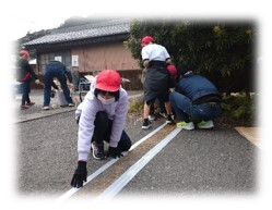 2月27日(火)の5~6限、4~5年生の児童たちが、市防災危機管理課皆様のご指導の下、校区内の道路で「標高表示ライン」の再塗装の作業に取り組みました。