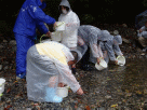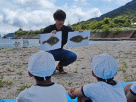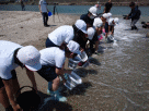 最初にスタッフの方から、ヒラメの特徴(「左ヒラメと右ガレイ」等)や成長過程、「オヒョウ」と呼ばれる全長数メートルにも及ぶ巨大ヒラメ等についての説明を受け、その後、志摩市にある県の浜島栽培漁業センターで孵化し、古江にある県の尾鷲栽培漁業センターで約8センチまで成長したヒラメの稚魚約400匹を、「それゆけ!海の宝物!」との掛け声と同時に、バケツを使って何度も波打ち際に放ちました。