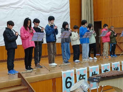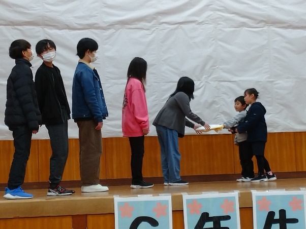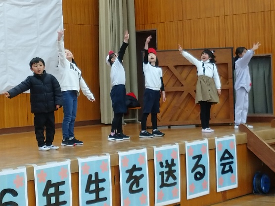 卒業を間近にひかえた6年生(5名)のために、4・5年生が実行委員となり、毎年恒例の「6年生を送る会」を体育館で開催しました。1・2年生「くじらぐもと歌『にじ』」、3年生「おわせ育の発表」、4年生「群読」、5・6年生「合奏」と、各学年による出し物が披露された後、最後に縦割り班の1~5年生の後輩たちの寄せ書き色紙が、1年生の手で6年生5名に手渡されました。いよいよ、3月19日が巣立ちの日~卒業式です。
