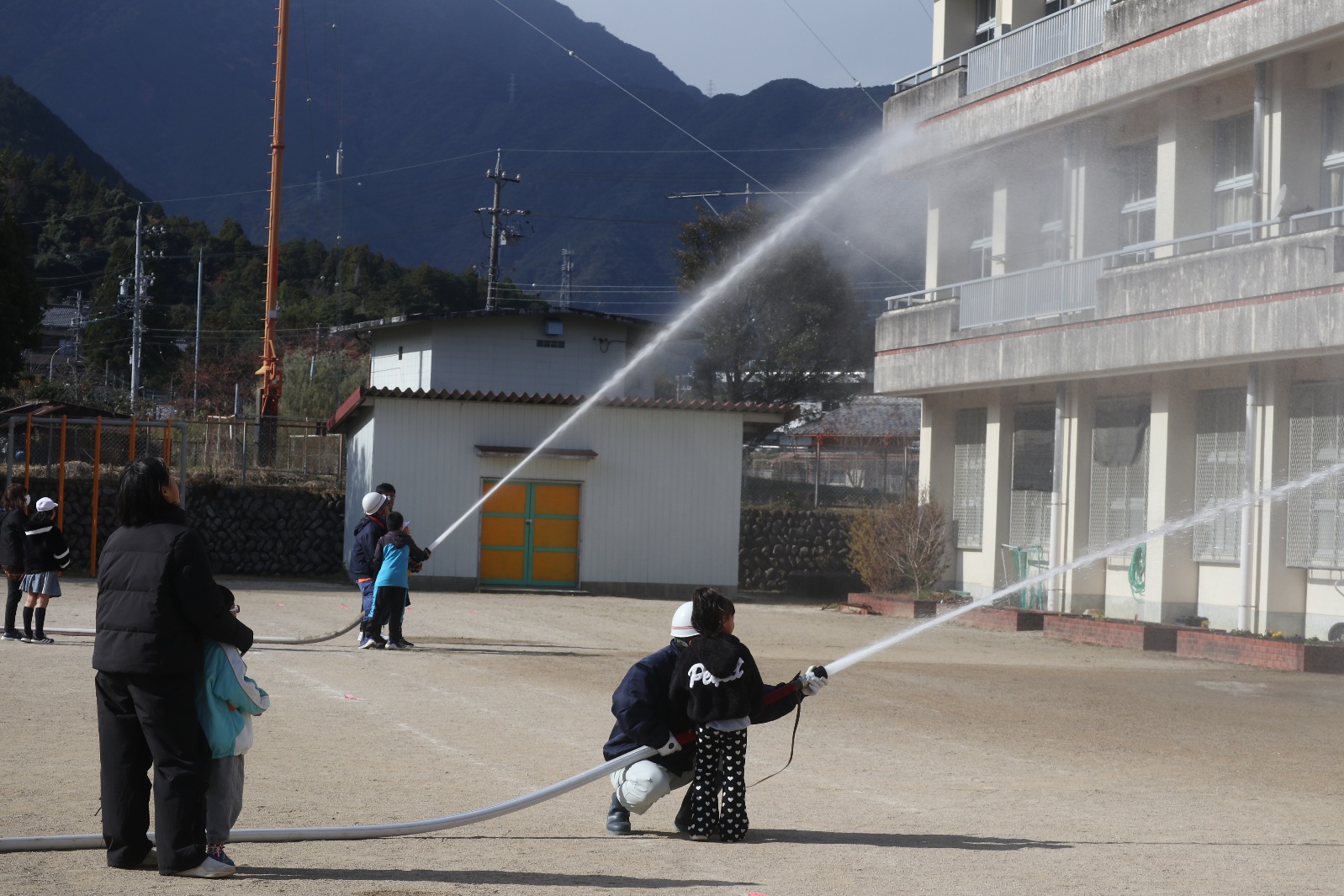 尾鷲市防災危機管理課・尾鷲市消防団の協力で、水消火器、煙ハウス、放水の体験を行いました。。