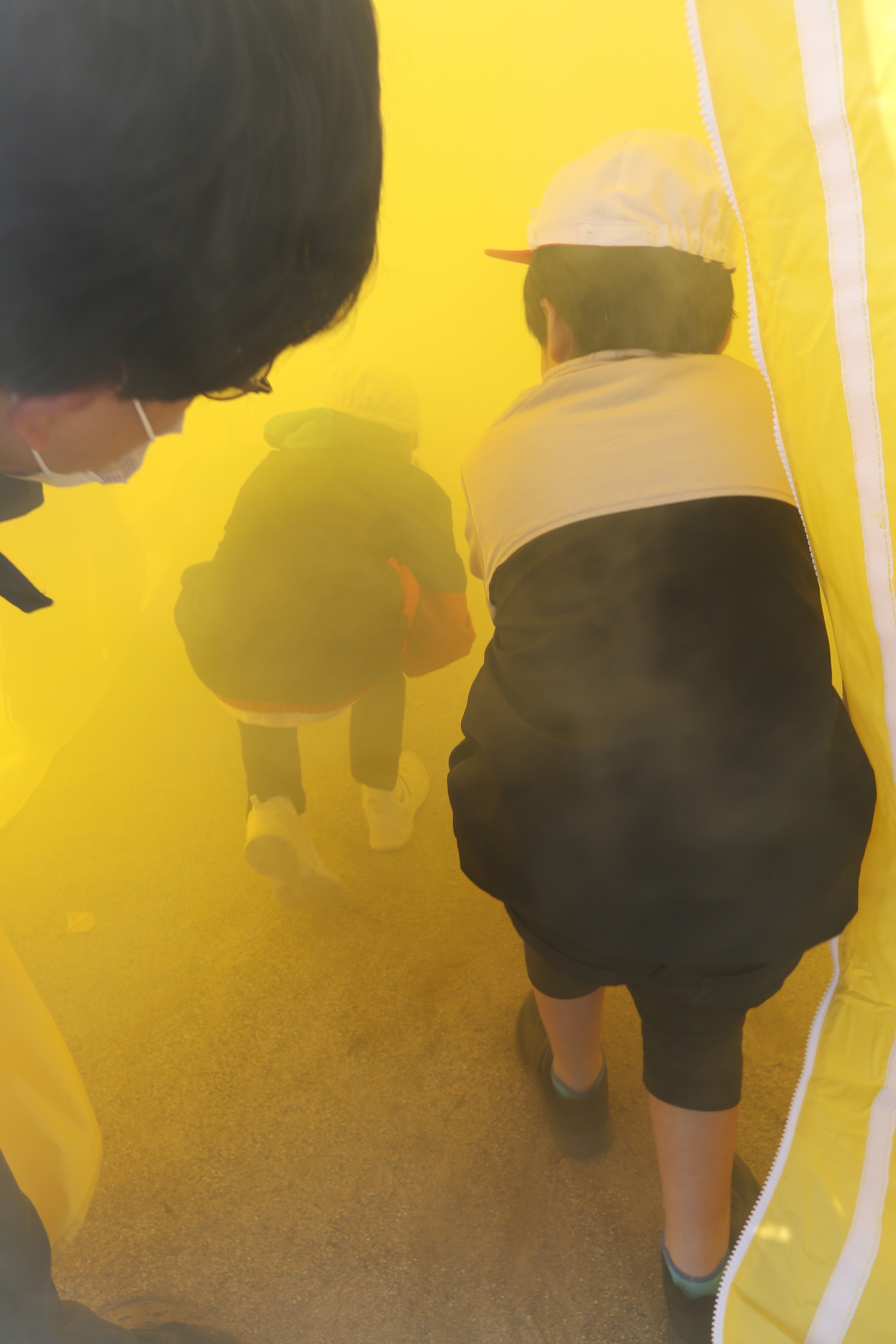 煙ハウスでは煙が充満したテントの中を低い姿勢でハンカチや服で口をふさいで通り抜けました。
