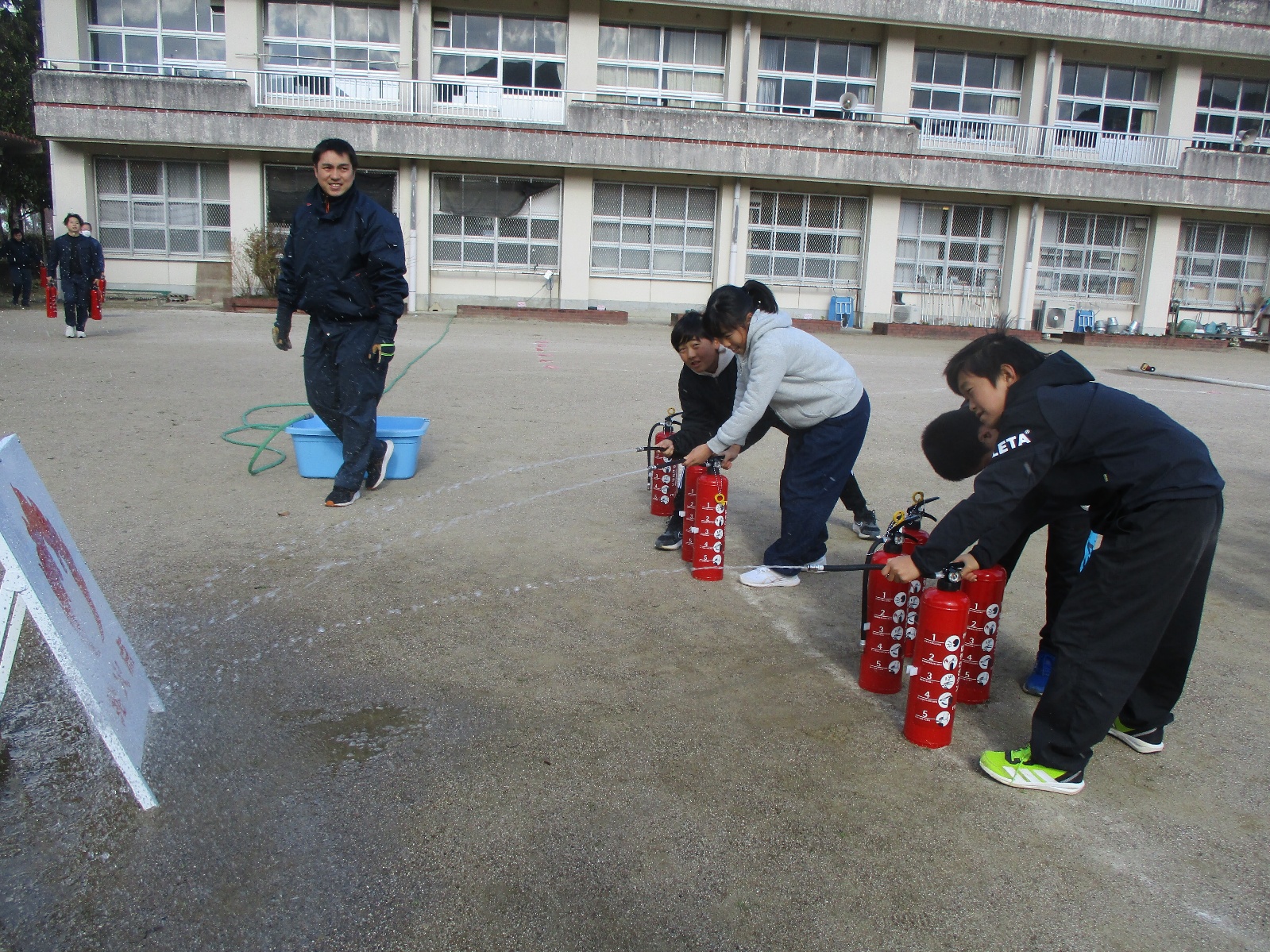 水消火器を使った訓練では「火事だ」と大声で周りに注意を呼びかけてから、的に向かって放水しました。