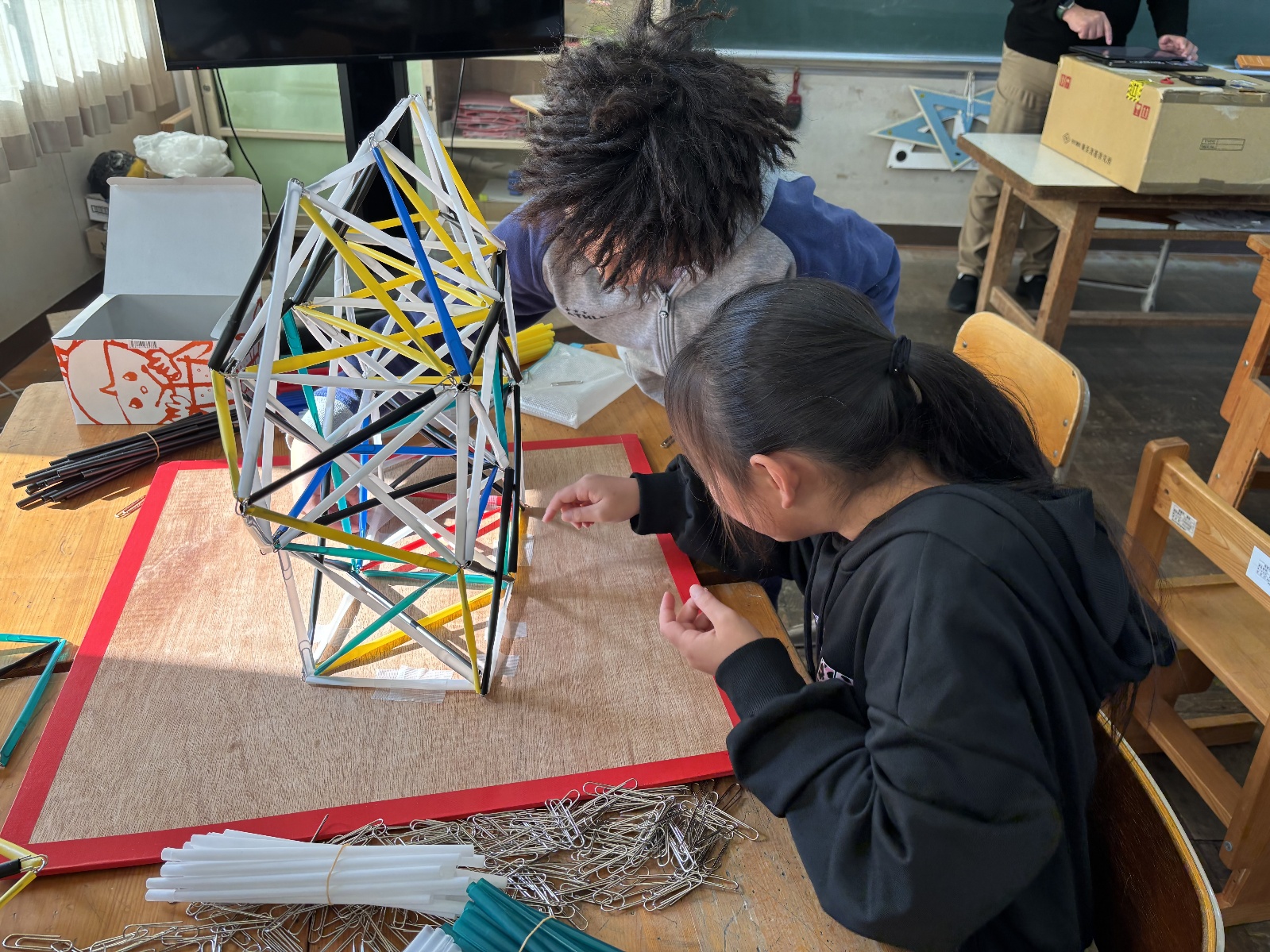3・4年生はストローハウス作成で耐震構造について学習。「地震に強い家」をデザインし、ストローを使って実際に組みたてました。