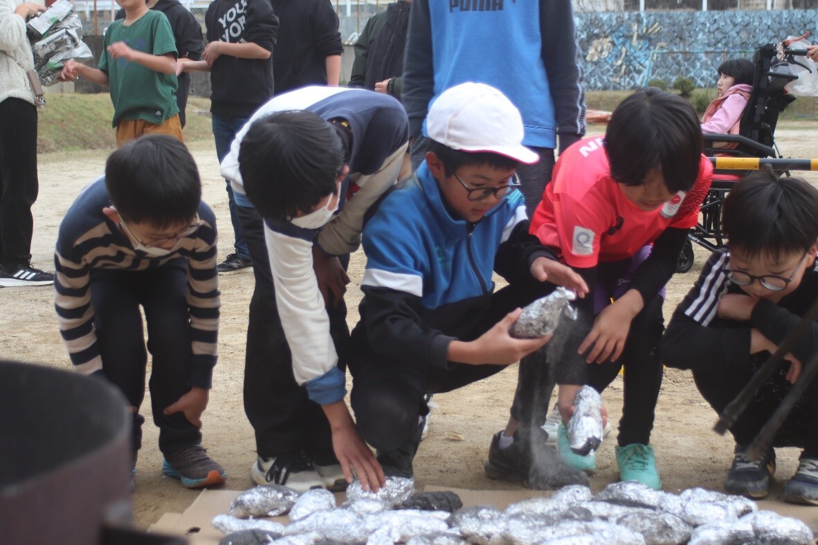 12月18日(月)、焼き芋大会(校内レク大会)を実施しました。今回焼いた芋は、これまで子どもたちが育ててきた3種類のさつまいも(紅はるか、シルクスイート、安納芋)です。焼きあがるまでの間に児童会の子達が中心となって全校遊びをした後、みんなで焼き芋を食べました。3種類ともおいしく、子どもたちからは「お店のよりおいしい!」という声が上がっていました。食べた後に聞いたところ、今年の一番人気は安納芋でした。