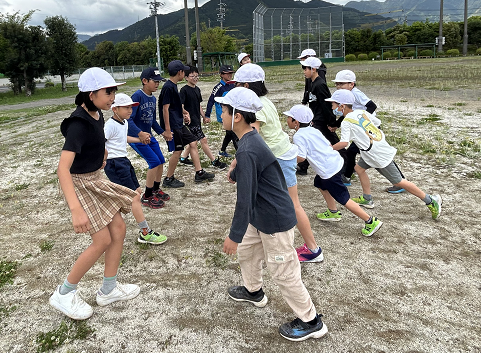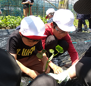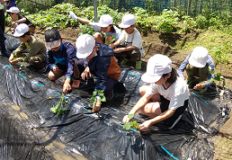 全校でサツマイモの苗を植えました。秋にたくさん収穫し、おいしい焼き芋が食べられるように、順調に育ってほしいです。