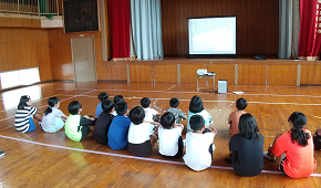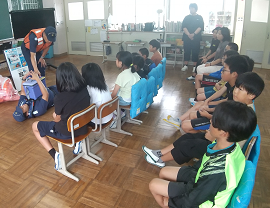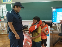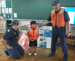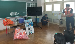 尾鷲海上保安部の方々を講師に、水難事故防止のための安全指導が行われました。お話と映像で、水難事後に遭わないための具体的な方法を教えていただきました。