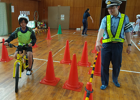 交通安全教室が行われました。尾鷲警察署交通課の方と交通安全アドバイザーの方から、交通安全についての話を聞いた後、自転車の安全な乗り方について、お手本を見せてもらったり、実際に乗って練習したりしました。
