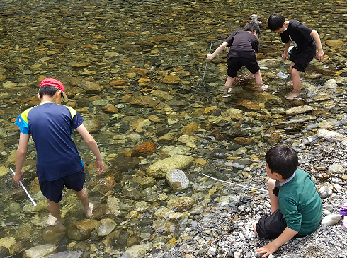 春の遠足 4月25日(金)、春の遠足で種まき権兵衛の里とその前の川原(銚子川・平尾)に行ってきました。曇りがちの天気でしたが時折日差しもあり、遠足日和の中、実施することができました。